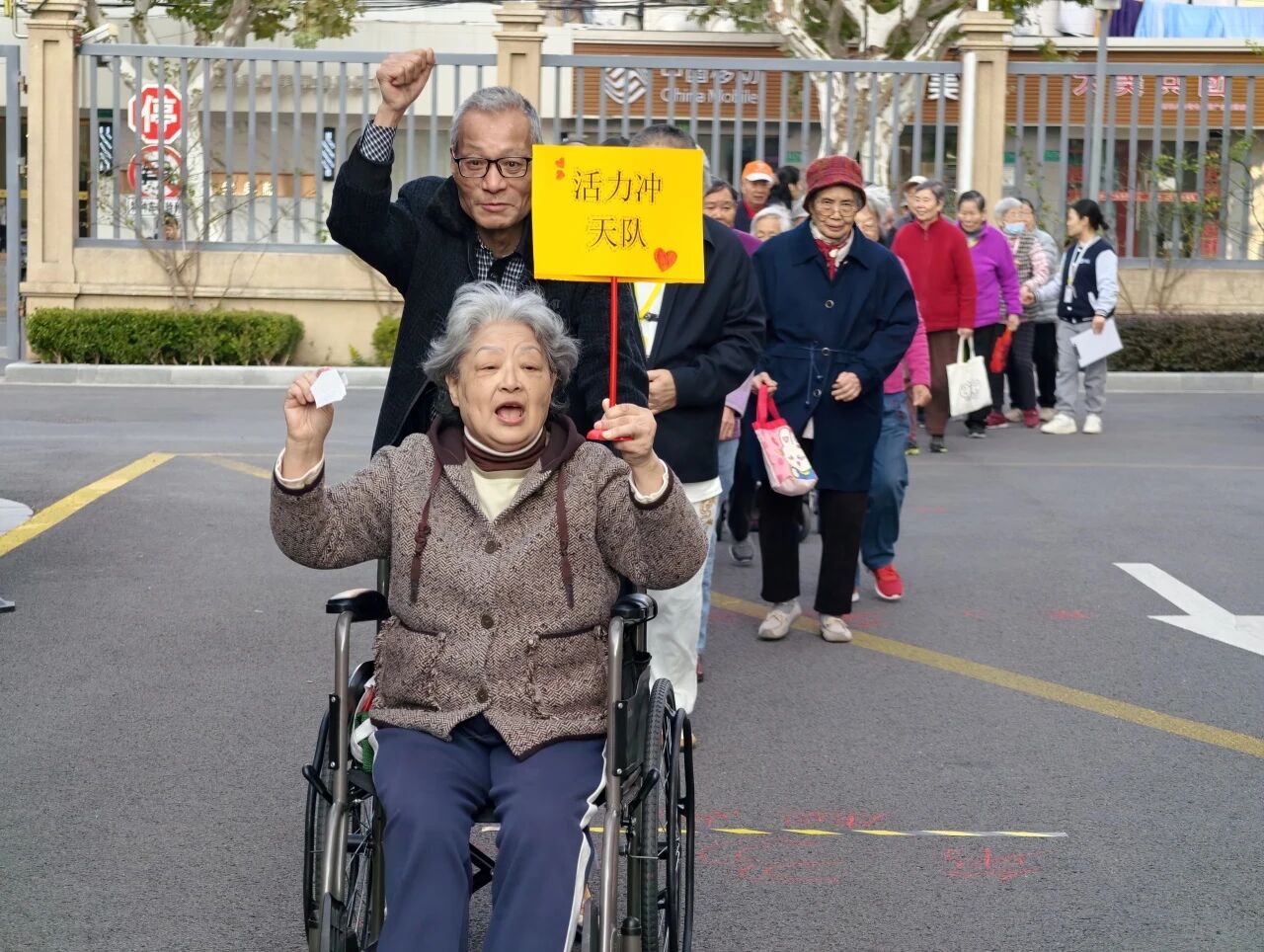 “活力冲天队”中,坐轮椅的队长曹奶奶领队,高举黄队牌带领全队喊出“迈向胜利,一往无前!”的响亮口号,身后长者们步伐间满是雀跃。