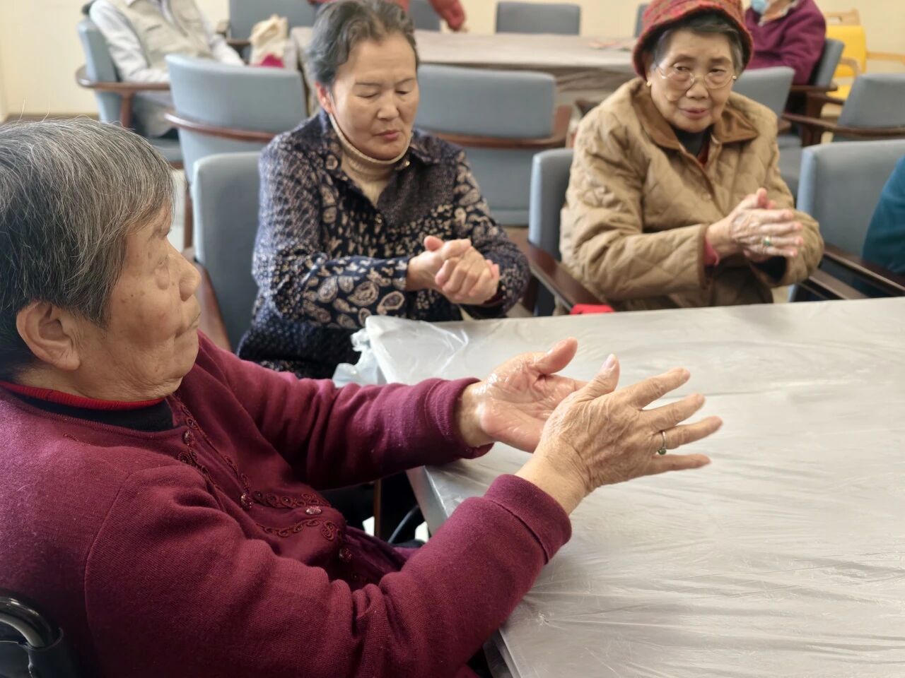 活动桌前,爷爷奶奶们纷纷亮出绝活。填馅的动作细致入微,捏褶的技巧各有妙招。手法娴熟的长者还主动当起“小老师”,手把手教身边伙伴,不一会儿,元宝饺、月牙饺、花边饺……一个个形态各异的饺子摆满托盘,活动室里的欢笑声,比窗外的阳光还要明媚。