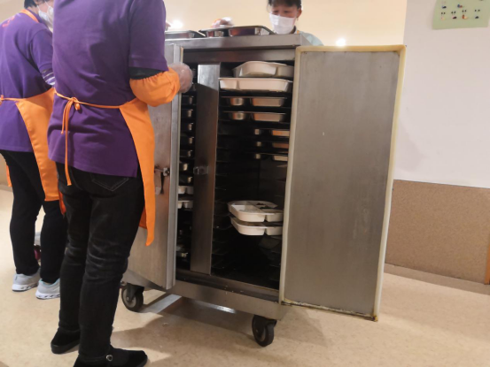 餐食准备好之后便是各楼层的护理组长到饭点时来取餐放入餐车之内,而我们的餐车也内有乾坤。天气冷了之后,院内特意换成了保温餐车。餐车内水温可达到80℃至90℃,这样可以确保餐食到达长者手中之时还是热的。