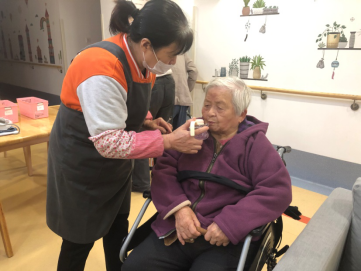 58岁的护理员崔玲芳早上正在给陈阿姨喂饭,陈阿姨因脑梗过,行动不便,长期坐轮椅,生活不能自理,每顿饭菜都是经过搅碎机打碎,崔玲芳每天一勺一勺耐心喂,因为脑梗压迫过神经,陈阿姨有时会不由自主的哭闹,崔玲芳要一边安抚她一边喂饭;记得陈阿姨住进来的第一天早上,给她进行日常的晨间护理时,突然被被陈阿姨打了一巴掌,当时我也什么都没说,“只要长者开心我们做什么都无所谓”崔玲芳想着,后来有的时候会偶尔打一下我的头,抓一下我的手,每次都会默默忍下委屈,陈阿姨的女儿看到了就会不停的跟我道歉,觉得特别不好意思,崔玲芳也只是笑着用手捂一捂,从来不会计较。