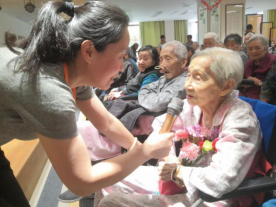 随后我们院内的小红人——张奶奶也为在座的长者献歌两曲,《雪绒花》、《闪闪红星》都是爷爷奶奶们耳熟能详的歌曲,长者们也忍不住跟着旋律一起哼唱。节目表演结束后,社工也将礼物赠送给了寿星们。