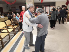 音乐一开始,奶奶们便跟着音乐翩翩起舞,丝毫不见任何生疏与羞涩。就算有不会跳舞的奶奶,其他奶奶也耐心地教其基础步法。伦巴、慢三、恰恰、慢四……爷爷奶奶们一首曲子完了之后便会坐在一旁休息片刻,但是在下一首音乐响起之时便又起身投入美妙的舞曲之中。可不仅仅只有长者们呢,护理员们也加入了交谊舞兴趣小组当中,社工老师与家属也借着这个机会与奶奶一起享受这温馨一刻。