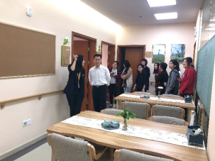 袁院长为领导们简要介绍了华康北桥老年福利院的整体功能布局,随后陪同柳局、钱书记一行人参观了机构单元区域、认知刺激区、家庭互动区、团体活动区、认知训练区、疗愈花园等地,进一步了解院内入住长者生活现状以及硬件软件设施。