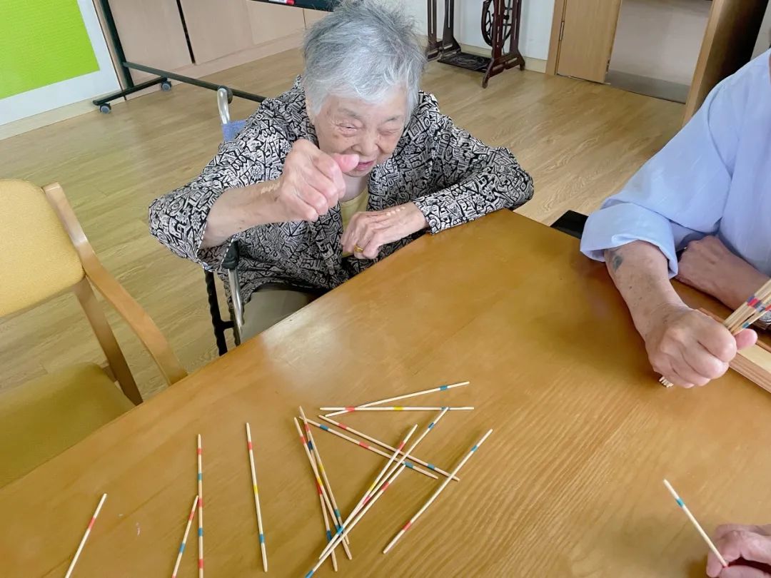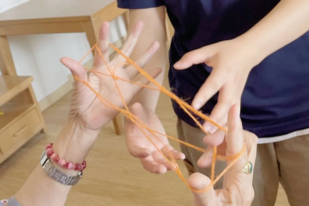 带长者一起重返童年,重温童年的快乐时光;养老院组织开展挑桃木棒、翻花绳等传统益智小游戏,让长者们在游戏的乐趣中找回童年的记忆,有效缓解了因黄梅天所带来的沉闷心情。