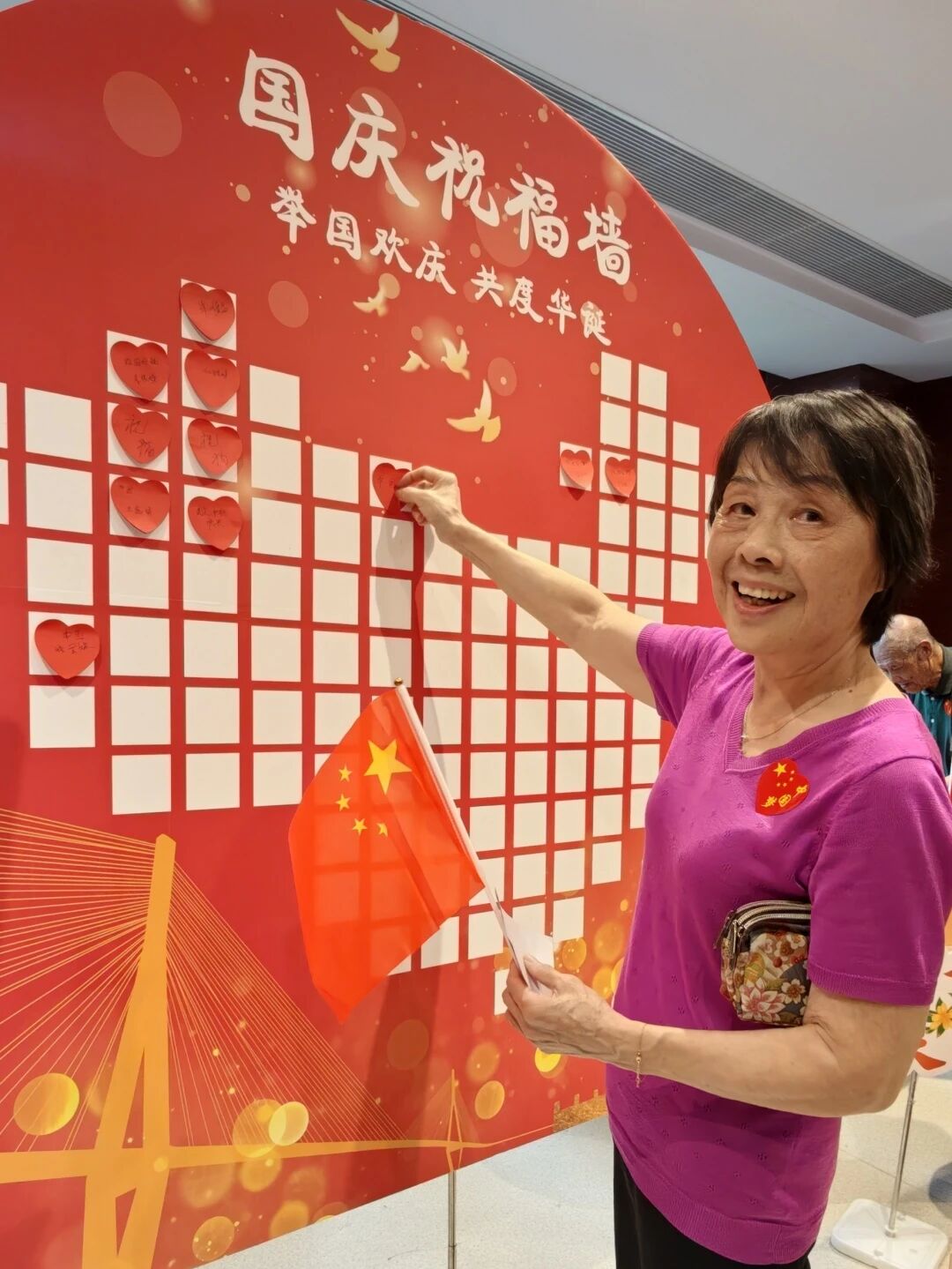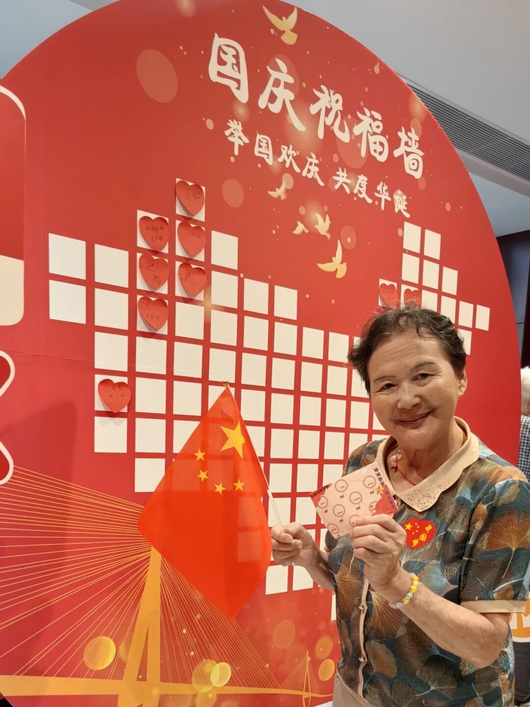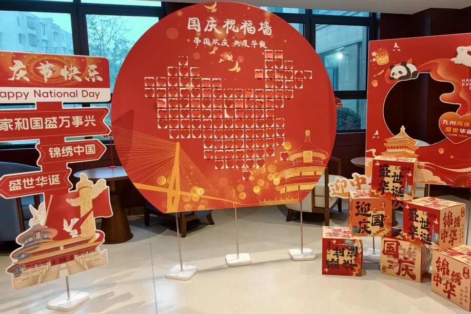 大厅的国庆祝福墙成了“告白现场”!红底圆牌上,心形便利贴写满对祖国的深情——“祝祖国繁荣昌盛”“日子越过越红火”。陈爷爷特意将“祖国越来越强”贴在最显眼处,坚定地说:“这话得让所有人看见!”