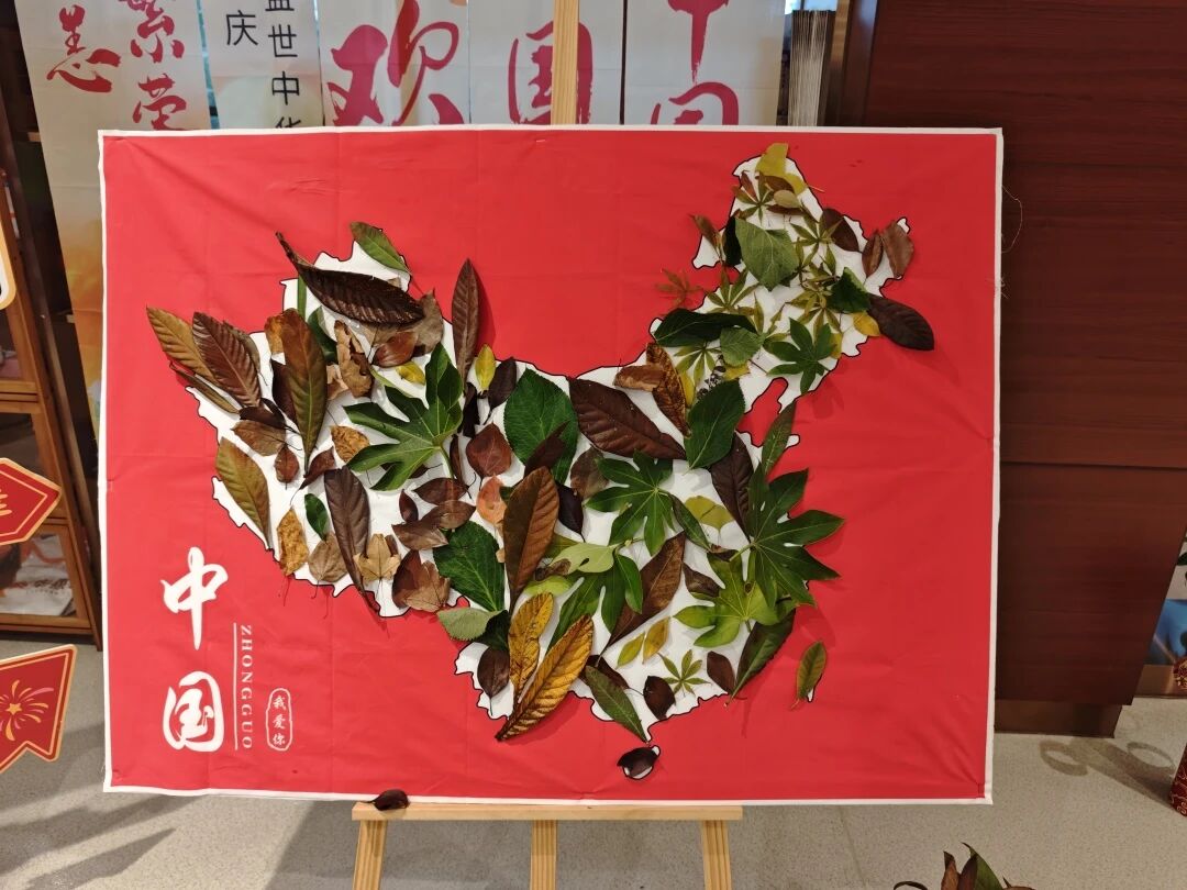 创作区铺满提前收集的银杏叶、枫叶、桂树叶,白色展板上的中国地图轮廓静待创作。长者们精心挑选叶片,一起合作拼凑成祖国的模样。完成后大家围着地图合影,叶片的纹路里满是对家国的热爱。