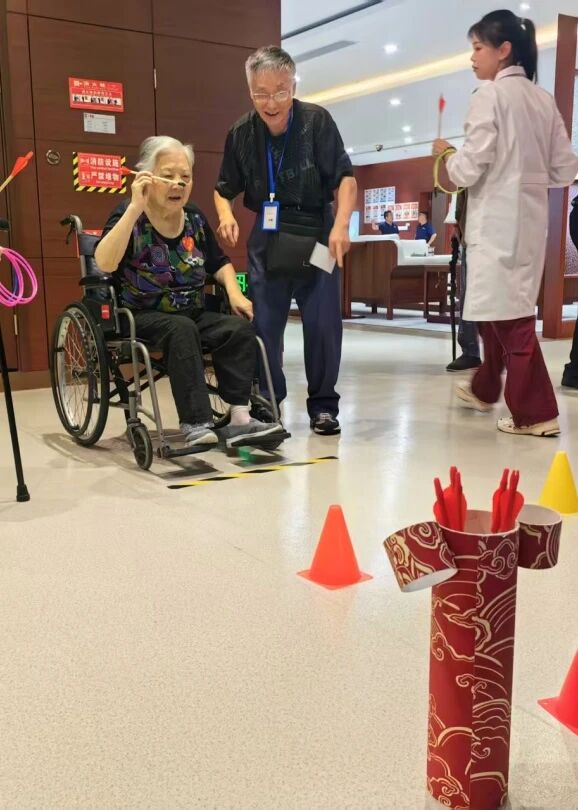 套圈区摆着香皂、护手霜、气垫梳子,投壶区立着红色箭靶。长者们站在指定线外,瞄准、投掷,每一次成功都引来阵阵欢呼。平时不爱出门的周奶奶,套中香皂和梳子后拉着人说:“下次活动我还来,这游戏太有意思了!”