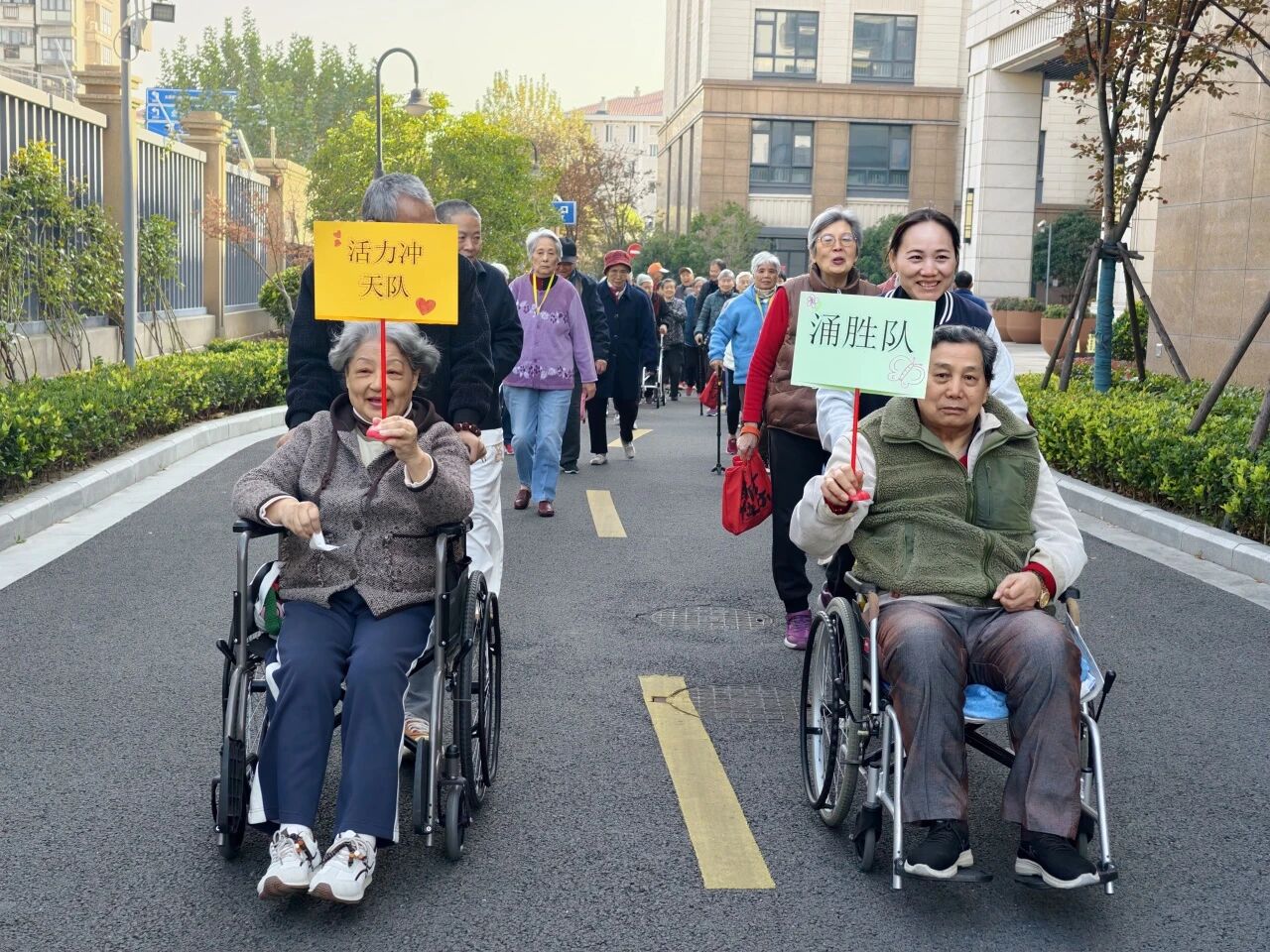“活力冲天队”中,坐轮椅的队长曹奶奶领队,高举黄队牌带领全队喊出“迈向胜利,一往无前!”的响亮口号,身后长者们步伐间满是雀跃。