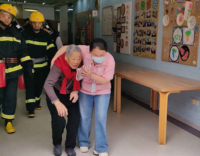 随着消防警报急促响起,演练正式进入实战阶段!各区域负责人严格依照应急预案分工,迅速到岗、高效履职:疏散引导组护理人员第一时间奔赴长者房间,轻声安抚长者情绪,耐心协助行动不便长者穿戴衣物,以搀扶、轮椅护送等方式,引导长者弯腰捂鼻、低姿前行,沿着指定安全通道有序撤离,全程耐心提醒 “不拥挤、不慌乱、保间距”,确保疏散过程平稳有序。