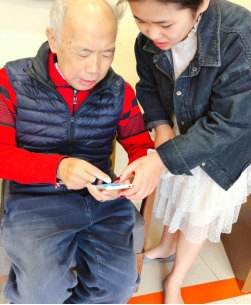 一开始有点不适应,但是护理员小汪对我很好,各种各样事情都帮我整理好。我每周二和周四去医院做血透,护理主任不放心我,每次都会提前帮我叫好出租车,看着我坐上车离开才放心,有时去医院看病也经常陪着我去挂号陪诊。小扶也经常过来和我们做活动,陪我聊天下棋,我女儿有事情也会和小朱电话里讲。后来,小扶教我使用手机,在微信上跟女儿聊天和视频,在这里,大家都很关心我,让我感觉到我并不是一个人,让我感觉很幸福。