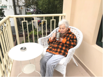 (图为长者坐在阳台晒太阳、喝咖啡)
