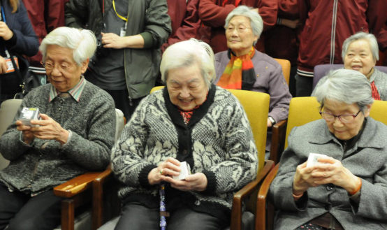 魔方表演秀开始之前,同学们将魔方交给爷爷奶奶打乱,奶奶们对于这个小东西可是非常好奇,而对于同学们拿着打乱过后的魔方非常快地复原表示非常厉害,最后,来自延安中学的同学们也将魔方送给了在座的奶奶。