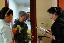 而对于行走不便同时也是三月过生日的长者,社工将礼物送到了房间。收到礼物的长者十分开心。拉着社工的手连连致谢。