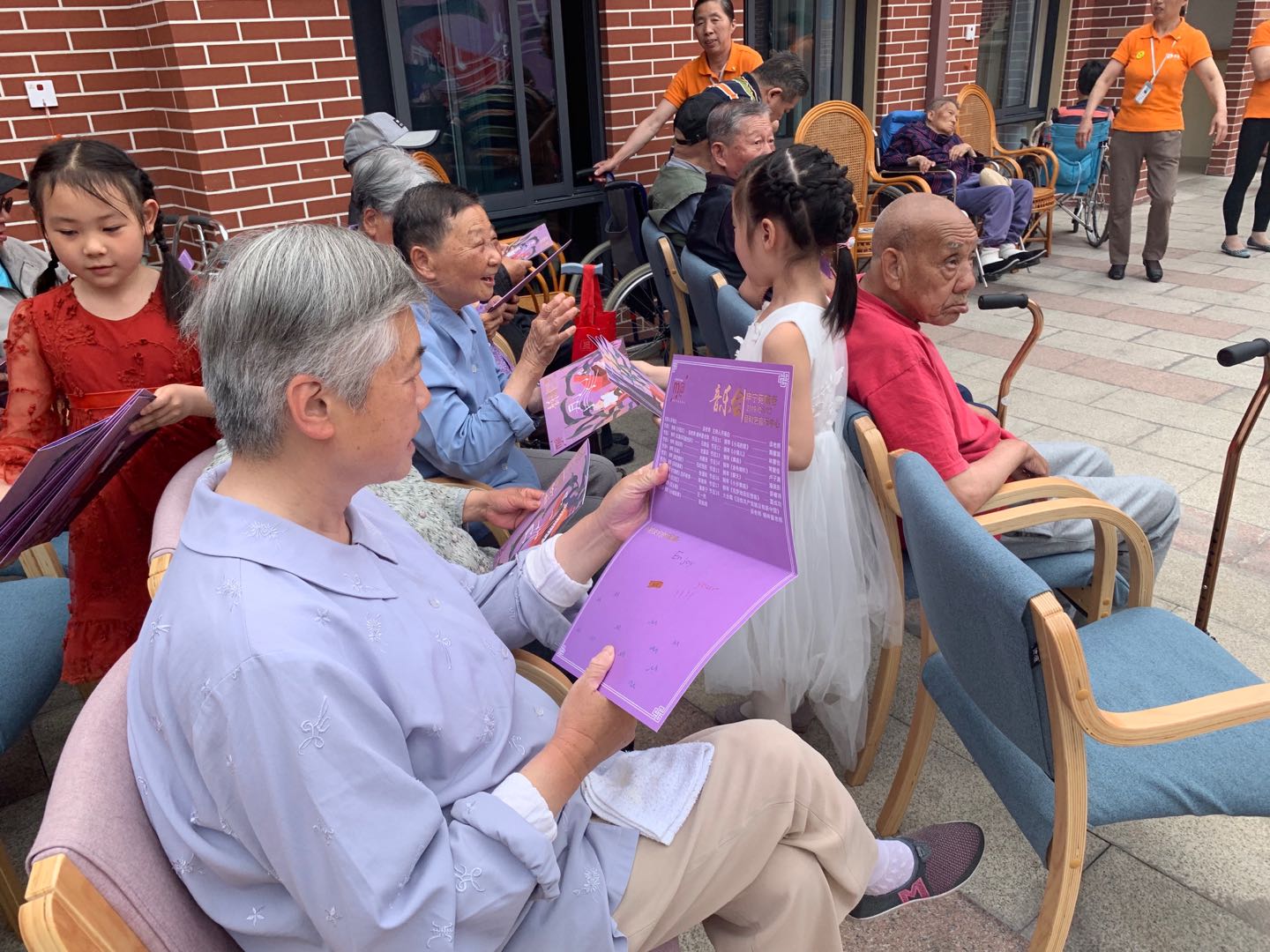 为了迎合长者的需求,本次演出的曲目都是以长者熟悉的老歌为主。一首温馨的《夕阳红》作为开场,让长者们倍感亲切,接下来的《南泥湾》、《东方红》、《红头绳》这些藏在记忆深处的旋律更是仿佛把长者带回了年轻时期,随着熟悉的旋律不由自主地轻声哼唱起来,脸上的笑容也变得更加有光彩来。这些富有“心机”的准备不知不觉中拉近了长者们和台上表演者的距离。心的距离近了,大家相互之间的交流变得更加融洽自然。长者、孩子、老师、家长、工作人员,大家有说有笑,气氛和谐美好。