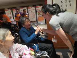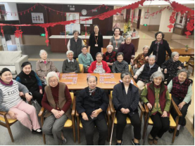 随后,社工让寿星们开始自我介绍,大家相互认识。这次生日最年长的奶奶有97岁,而最年轻的奶奶才73岁。大家都是来自不同的楼层,通过自我介绍,有两位同一天过生日的长者互相认识了,大家一起交谈,十分融洽。