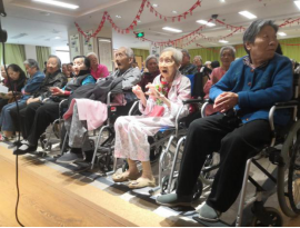 随后我们院内的小红人——张奶奶也为在座的长者献歌两曲,《雪绒花》、《闪闪红星》都是爷爷奶奶们耳熟能详的歌曲,长者们也忍不住跟着旋律一起哼唱。节目表演结束后,社工也将礼物赠送给了寿星们。