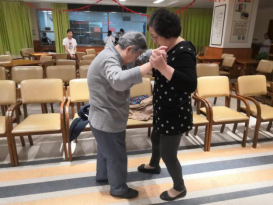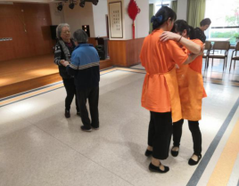 音乐一开始,奶奶们便跟着音乐翩翩起舞,丝毫不见任何生疏与羞涩。就算有不会跳舞的奶奶,其他奶奶也耐心地教其基础步法。伦巴、慢三、恰恰、慢四……爷爷奶奶们一首曲子完了之后便会坐在一旁休息片刻,但是在下一首音乐响起之时便又起身投入美妙的舞曲之中。可不仅仅只有长者们呢,护理员们也加入了交谊舞兴趣小组当中,社工老师与家属也借着这个机会与奶奶一起享受这温馨一刻。