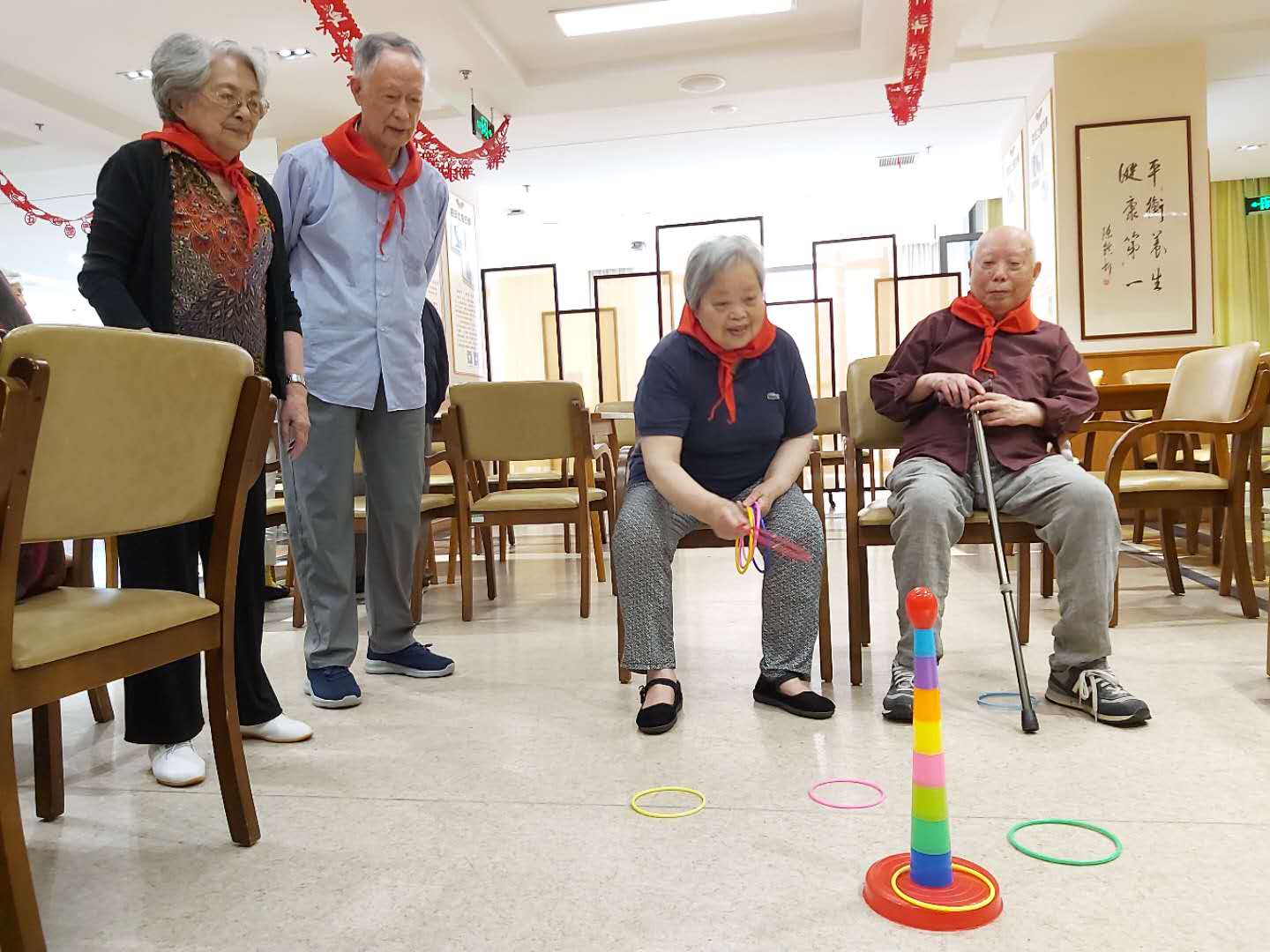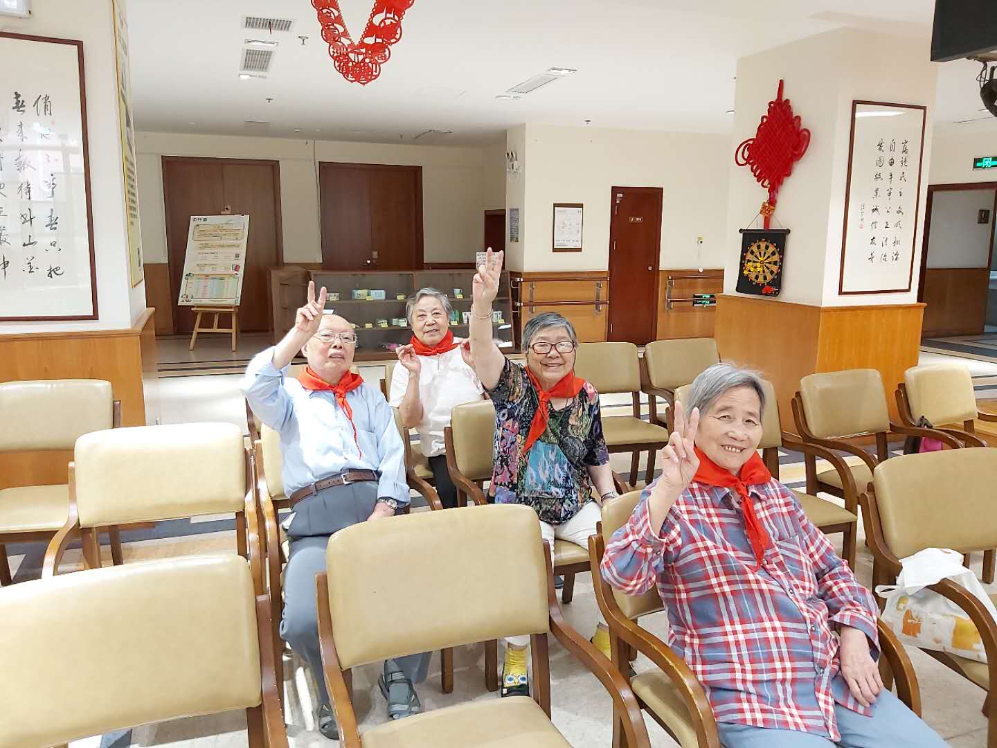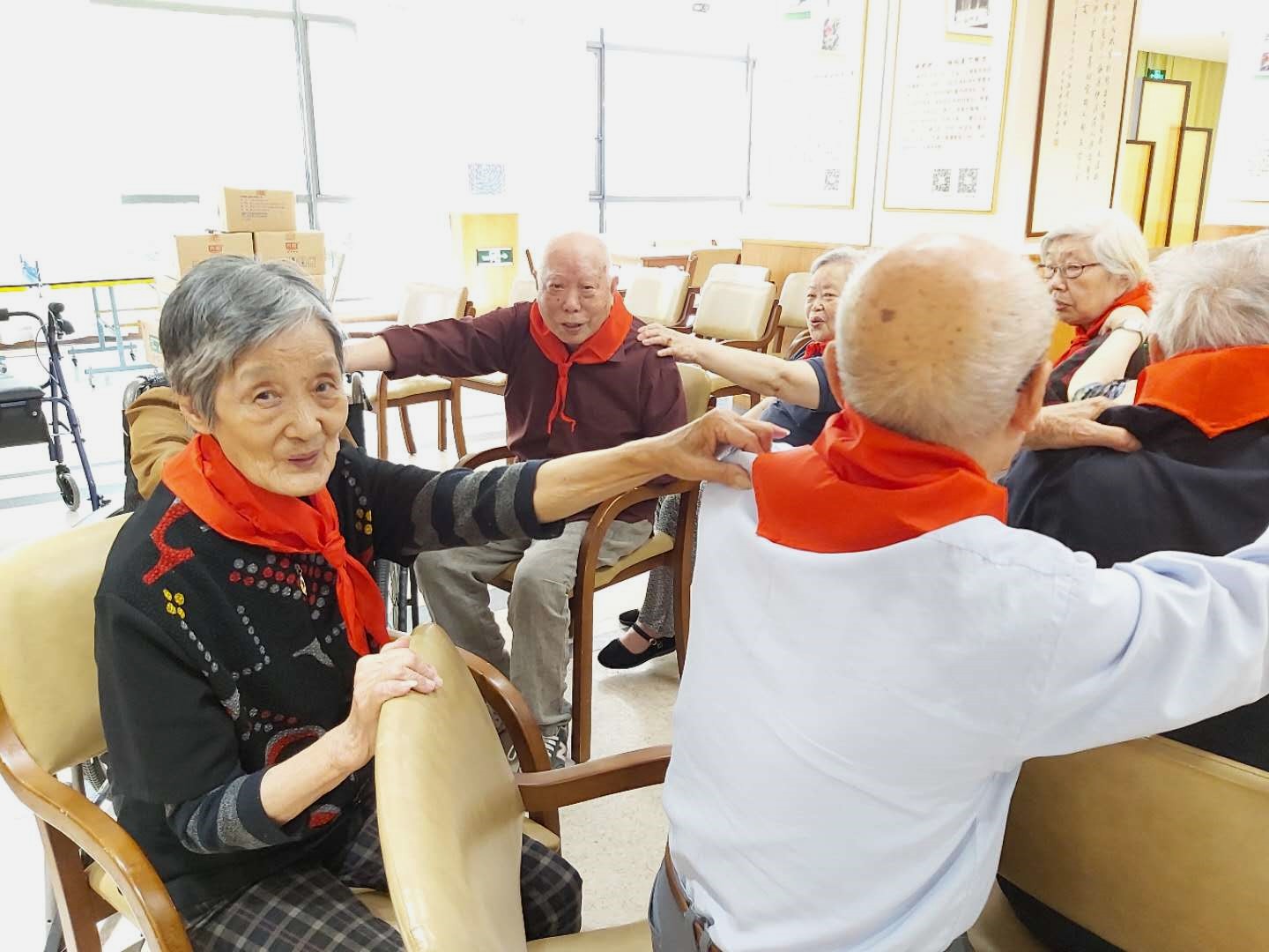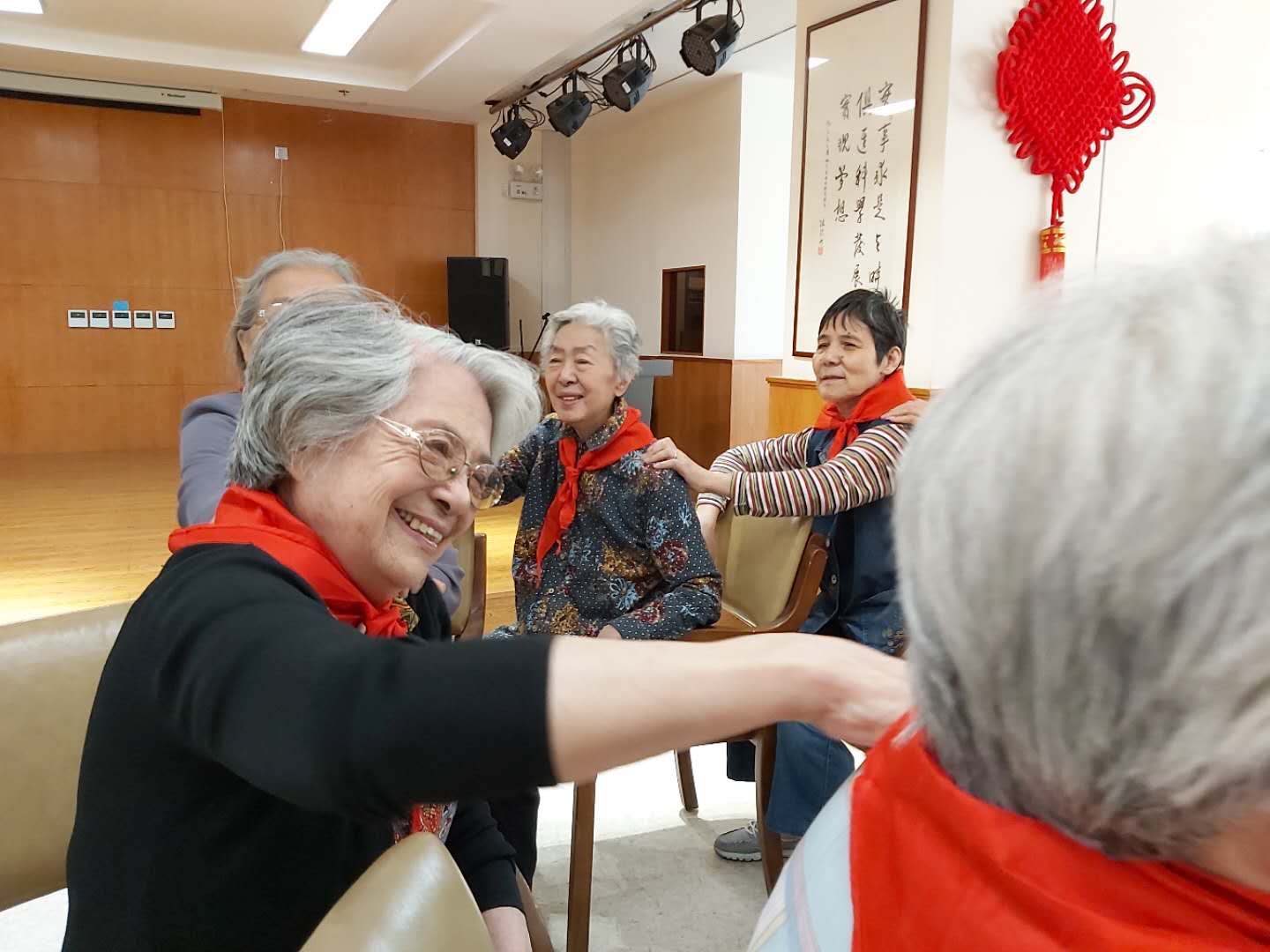 在游戏正式开始前,社工为长者们佩戴上了红领巾。长者们笑着说“我们又不是小孩子了”“我们早就过了戴红领巾的日子啦!”长者们嘴上这样说,戴红领巾的手却没有停,许是很久没有戴过红领巾了,长者们都说想自己试着戴一戴红领巾。当长者们看到彼此戴着红领巾时的模样,不禁相视一笑,仿佛都看到了对方小时候的样子。