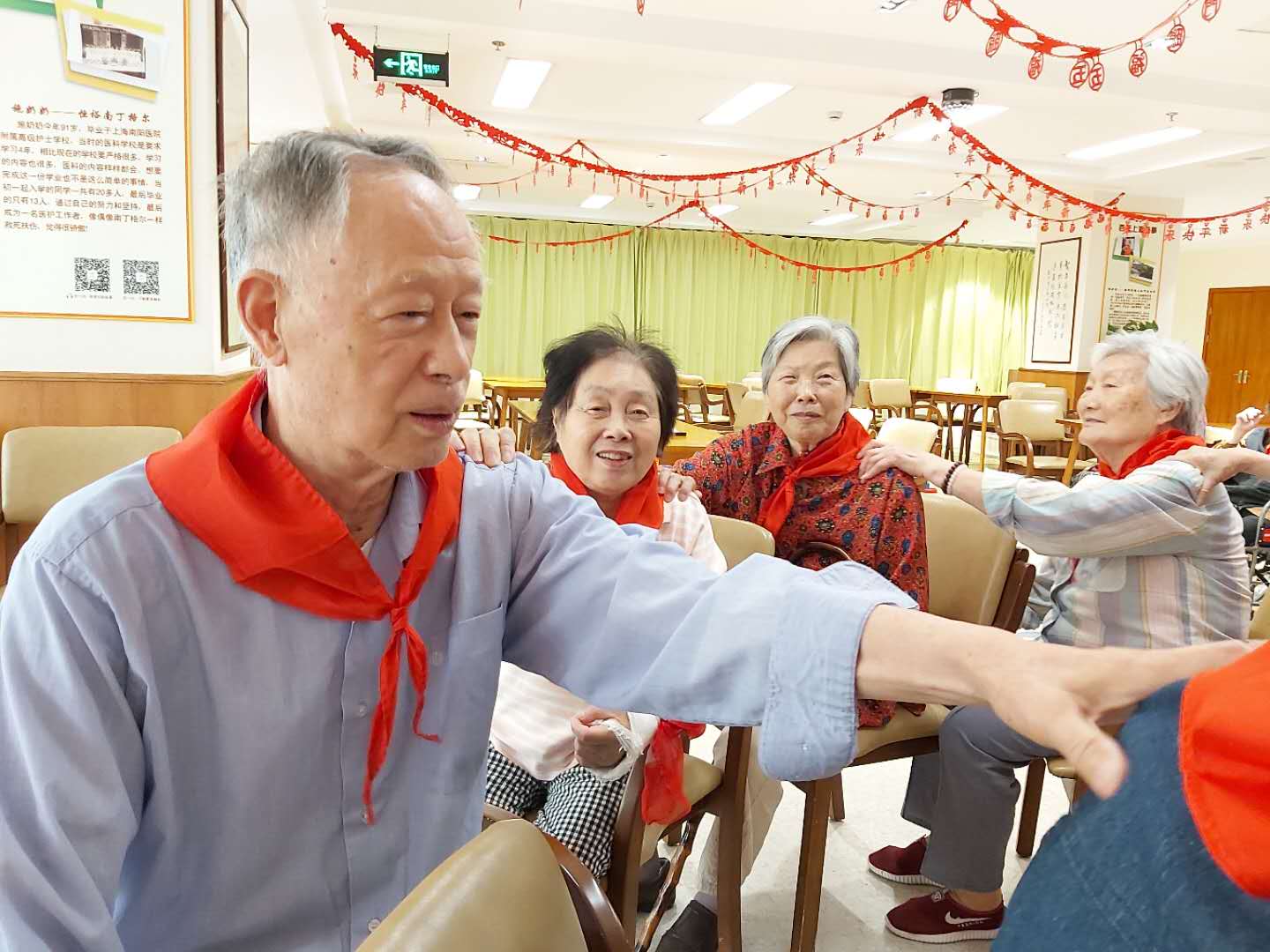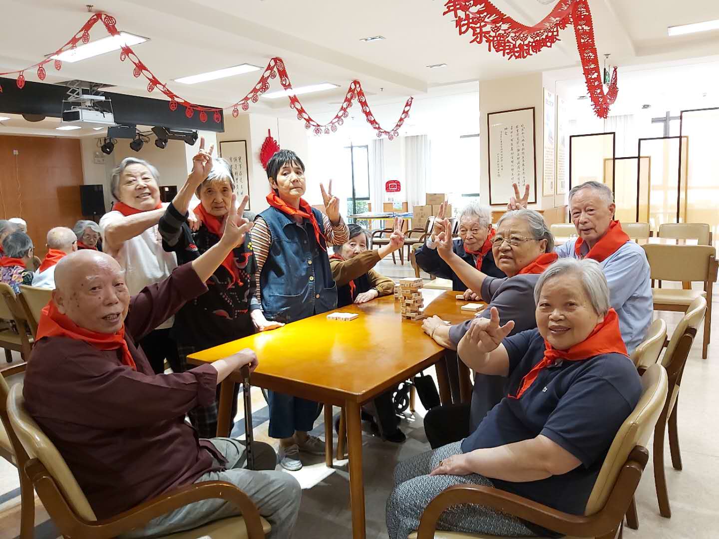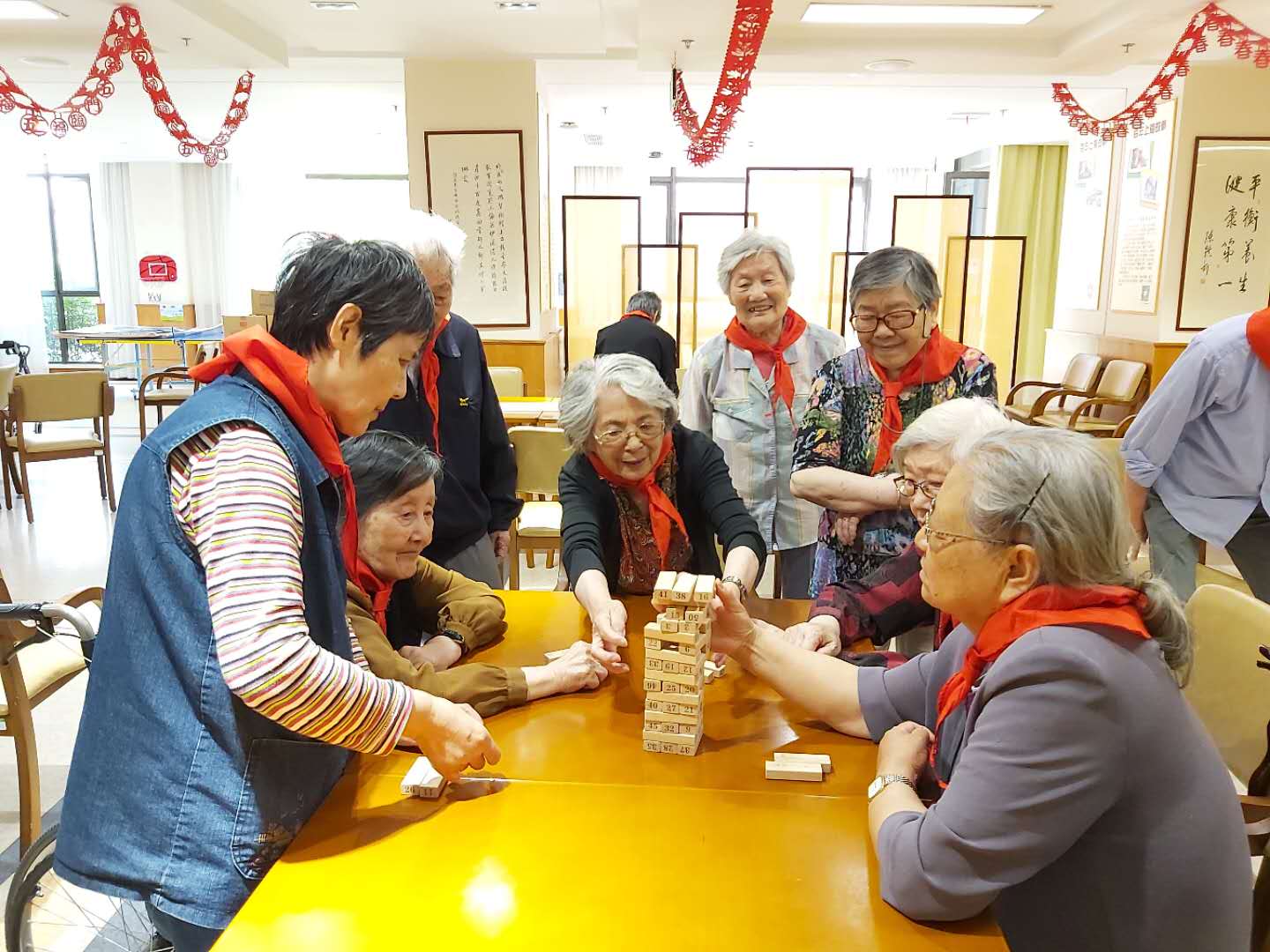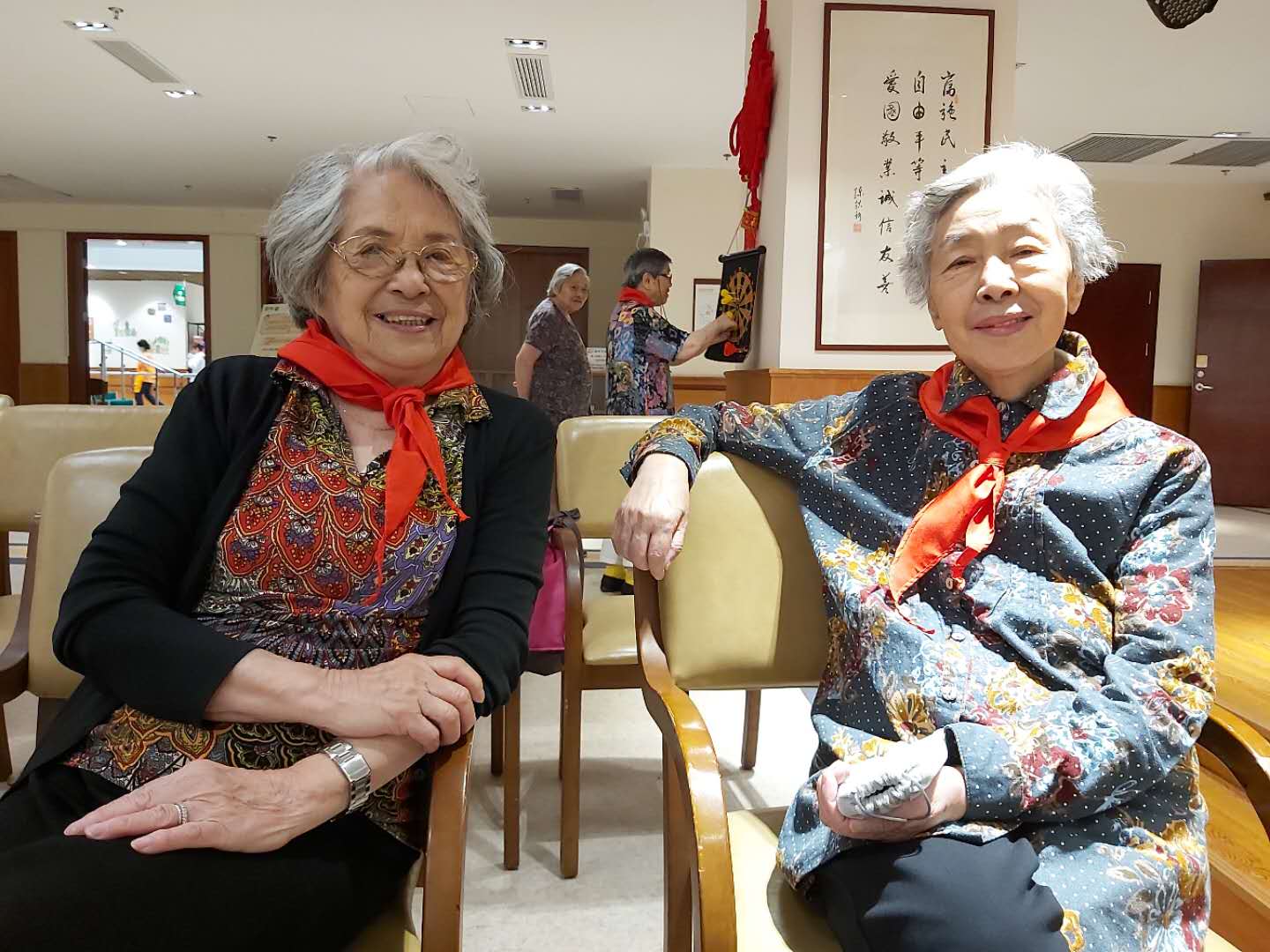 在游戏正式开始前,社工为长者们佩戴上了红领巾。长者们笑着说“我们又不是小孩子了”“我们早就过了戴红领巾的日子啦!”长者们嘴上这样说,戴红领巾的手却没有停,许是很久没有戴过红领巾了,长者们都说想自己试着戴一戴红领巾。当长者们看到彼此戴着红领巾时的模样,不禁相视一笑,仿佛都看到了对方小时候的样子。