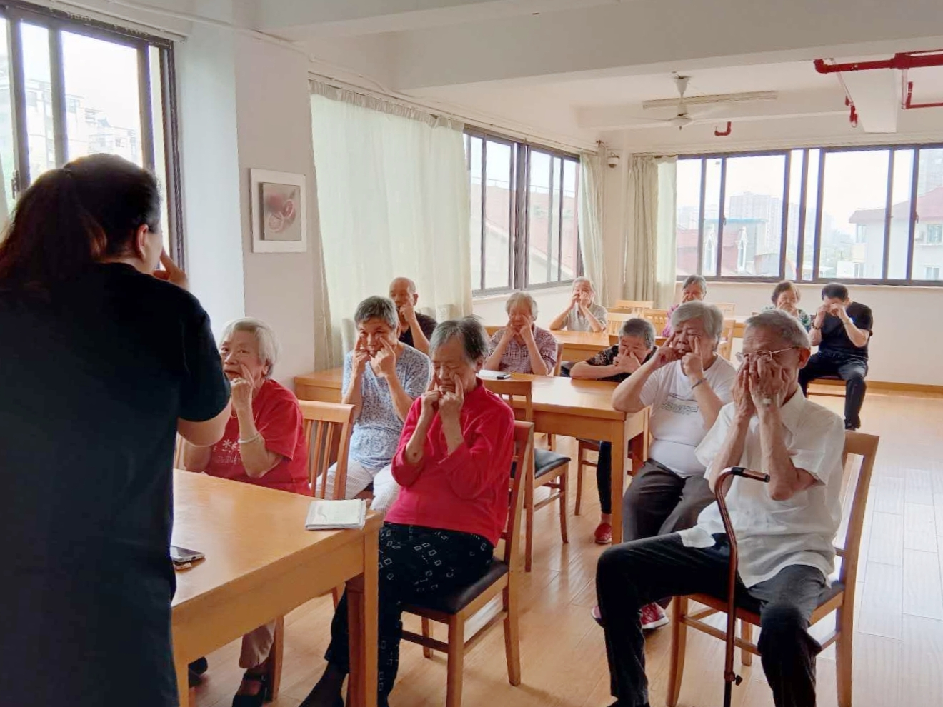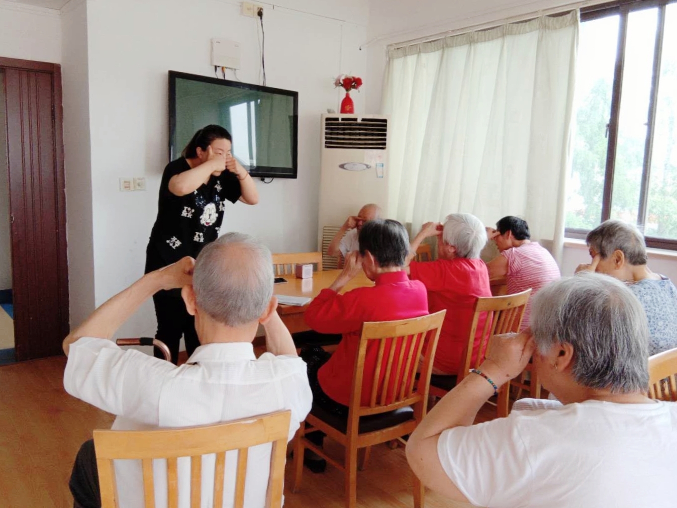 讲座结束后,在社工的带领下,长者们跟随着缓慢的旋律做起了眼部保健操,虽然有些长者已经不记得眼保健操动作要领了,但还是会跟着旋律努力回忆着,尽力做到标准,这样才能起到保健作用。