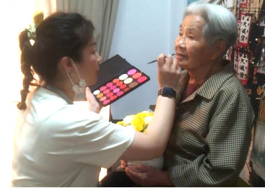 清早爷爷奶奶们就换上了最新最漂亮的衣服,护理员忙上忙下照顾和接送爷爷奶奶。“爱乐小屋”中,爷爷奶奶们在化妆等候,爱漂亮的李奶奶拉着化妆师温和的说:“我今天的衣服最适合柳叶眉,给我画一个吧,要细长美美的”。