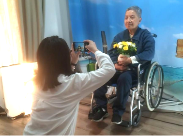 美乐教室里,相机、布景、灯光、配饰、道具一应俱全,摄影师调试好了镜头,只等着今天的主角登场。坐在镜头下的爷爷奶奶开始有点局促,摄影师使尽浑身解数只为逗爷爷奶奶们一笑,他们逐渐放松,更加自信,尽情展示自己。无微不至照顾着爷爷奶奶的护理员,亲切地搂着爷爷奶奶,配合默契地变换姿势。