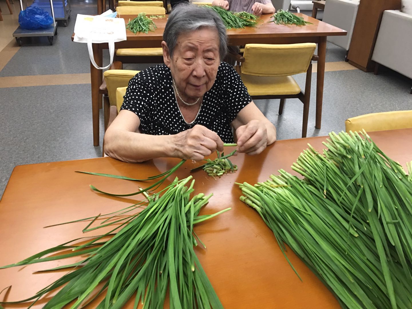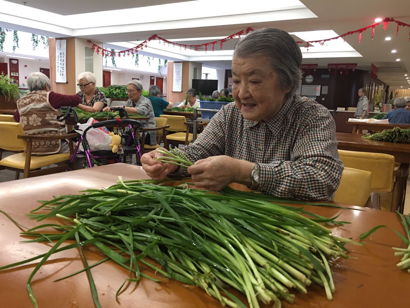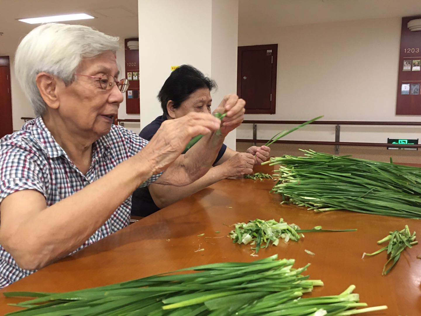 长者们来到二楼餐厅,一份份绿油油的韭菜,已经静静的躺在桌面上了。长者们落座后,熟练的拿起韭菜,一边择着菜,一边唠起了嗑。长者们的话题自然是从“菜”开始,“这个韭菜不错”“嗯,是蛮好额”,聊着聊着,长者们便从菜的本身聊到了怎么选菜、怎么做菜,韭菜炒蛋、韭菜饼,看得出长者们在年轻时一定也是厨艺了得!关于韭菜盒子为什么叫韭菜盒子,长者们也会认真讨论一番,长者们虽然年纪大了,但可爱的模样,却总能在不经意间,透露着他们年轻时的风采。