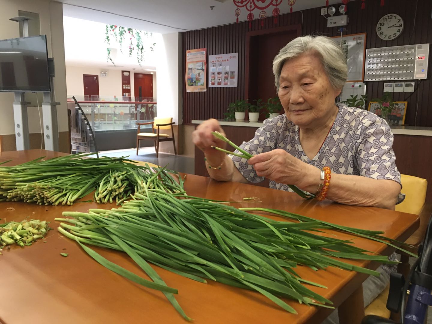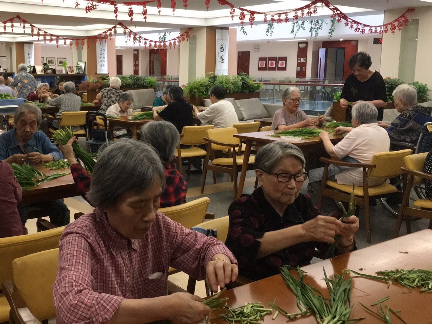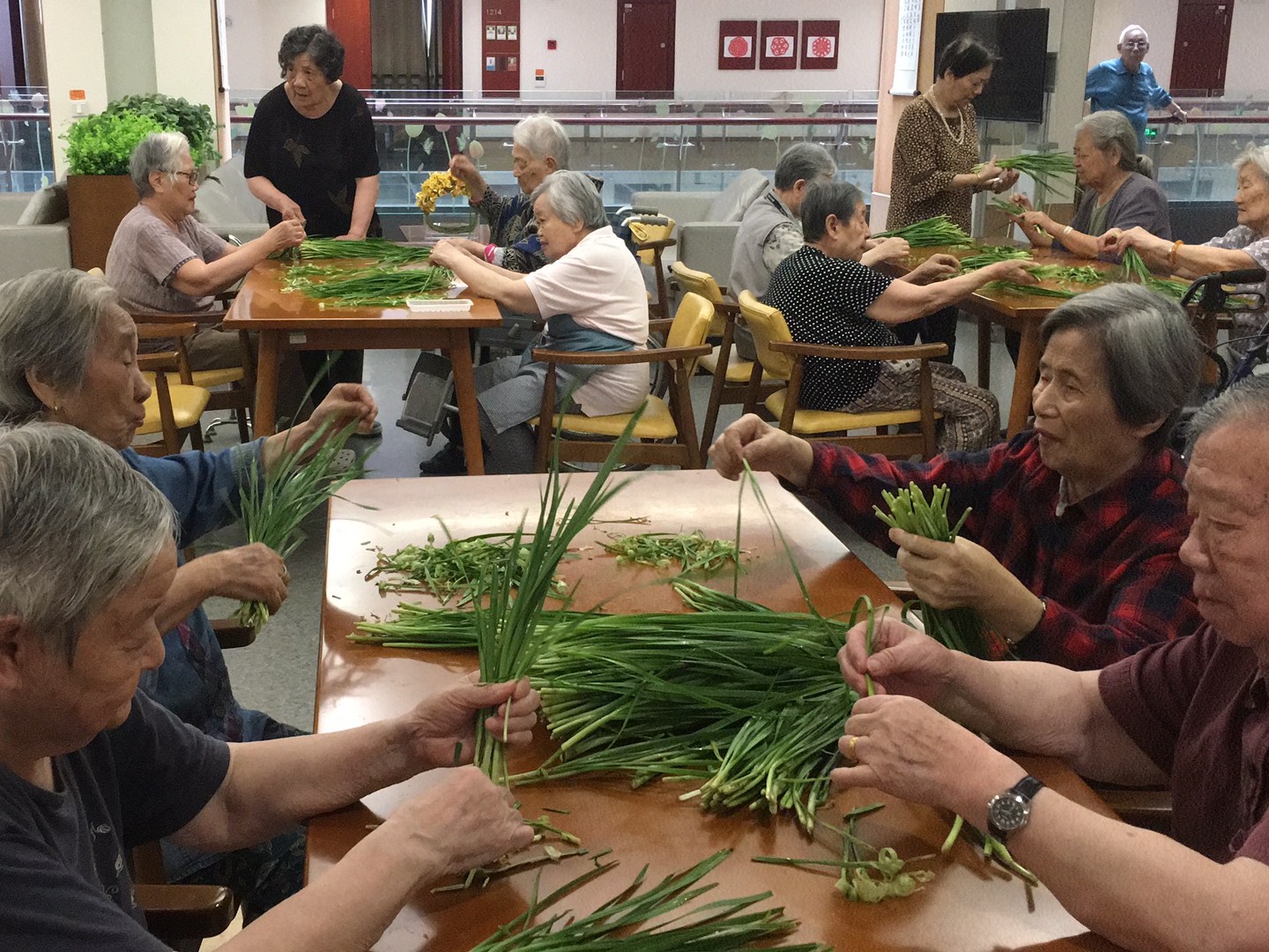 长者们来到二楼餐厅,一份份绿油油的韭菜,已经静静的躺在桌面上了。长者们落座后,熟练的拿起韭菜,一边择着菜,一边唠起了嗑。长者们的话题自然是从“菜”开始,“这个韭菜不错”“嗯,是蛮好额”,聊着聊着,长者们便从菜的本身聊到了怎么选菜、怎么做菜,韭菜炒蛋、韭菜饼,看得出长者们在年轻时一定也是厨艺了得!关于韭菜盒子为什么叫韭菜盒子,长者们也会认真讨论一番,长者们虽然年纪大了,但可爱的模样,却总能在不经意间,透露着他们年轻时的风采。