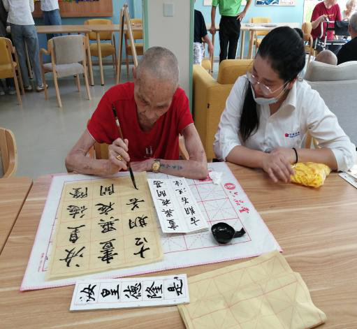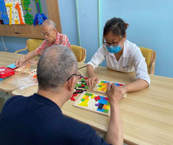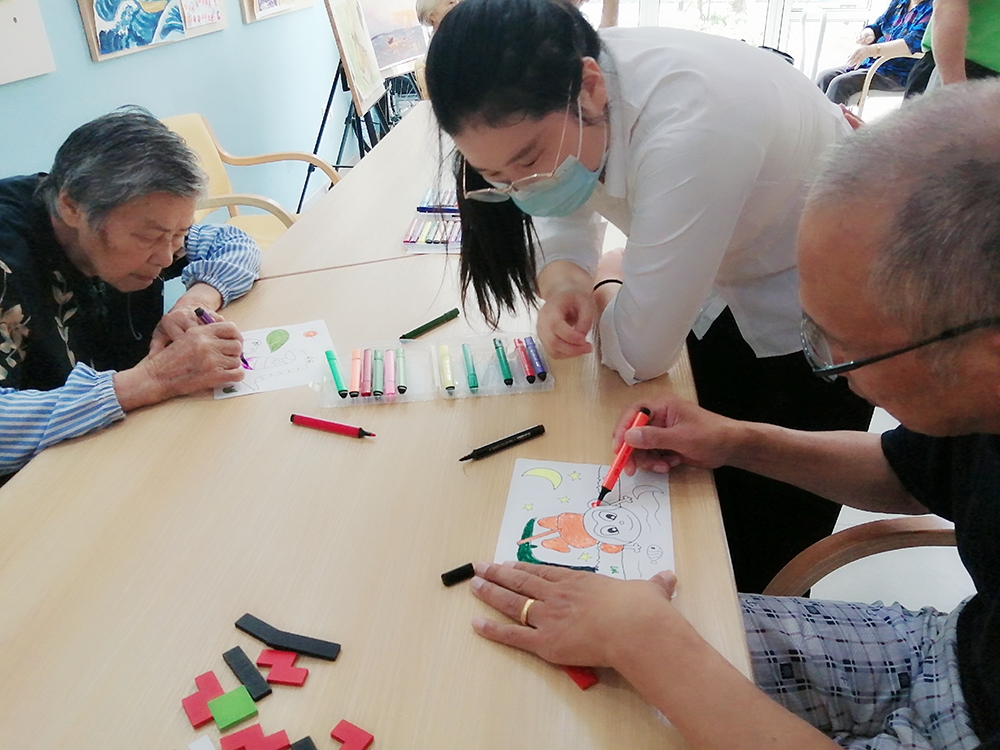 日精物流的小伙伴也热情参与到与长者们的互动活动中,长者林阿婆和李叔叔给小伙伴们展示了自己的绘画涂色能力;黄爷爷秀出一手漂亮的书法字;李叔叔和小伙伴拼手速,看谁先拼完五彩拼板。小伙伴感叹:长者们多才多艺,各怀绝技啊。通过这次的参观、互动活动,小伙伴了解到我院的长者们的平时生活丰富多彩,并不是她们印象中的,只是看看电视,望望窗外,散散步的枯燥老年生活。我院是一家专业的认知障碍长者照护机构,开展多种多样的认知刺激及训练活动。