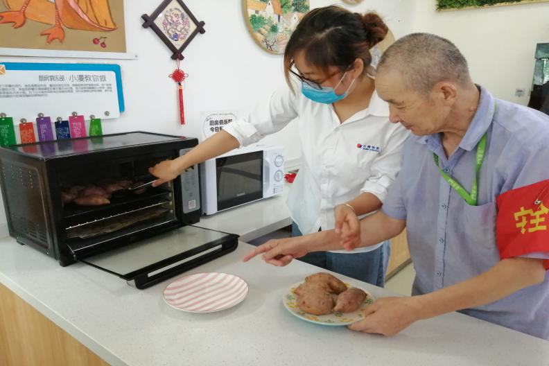 我院的厨房俱乐部也是隔三差五的营业,长者们烤烤红薯、蛋挞、鸡翅,做做蛋黄酥、冰皮糕点等,就如在家一般温馨、自在。这不,今天长者们为来参观慰问的小伙伴烤了一大盘拔丝红薯,还没出炉,就已经香味扑鼻而来,弥漫整屋。一出炉,何叔叔就迫不及待的端着盘子装上红薯去分给小伙伴们。