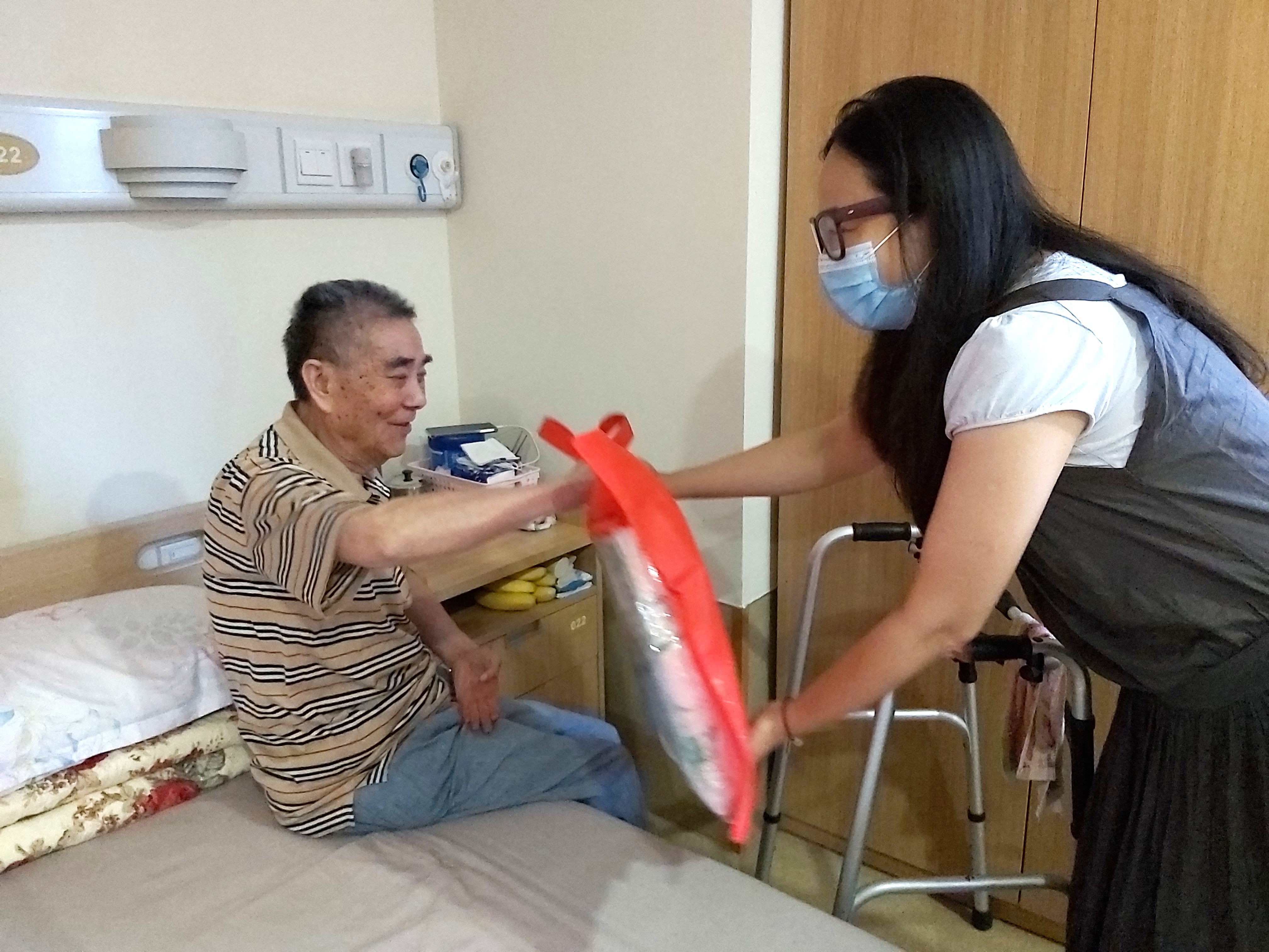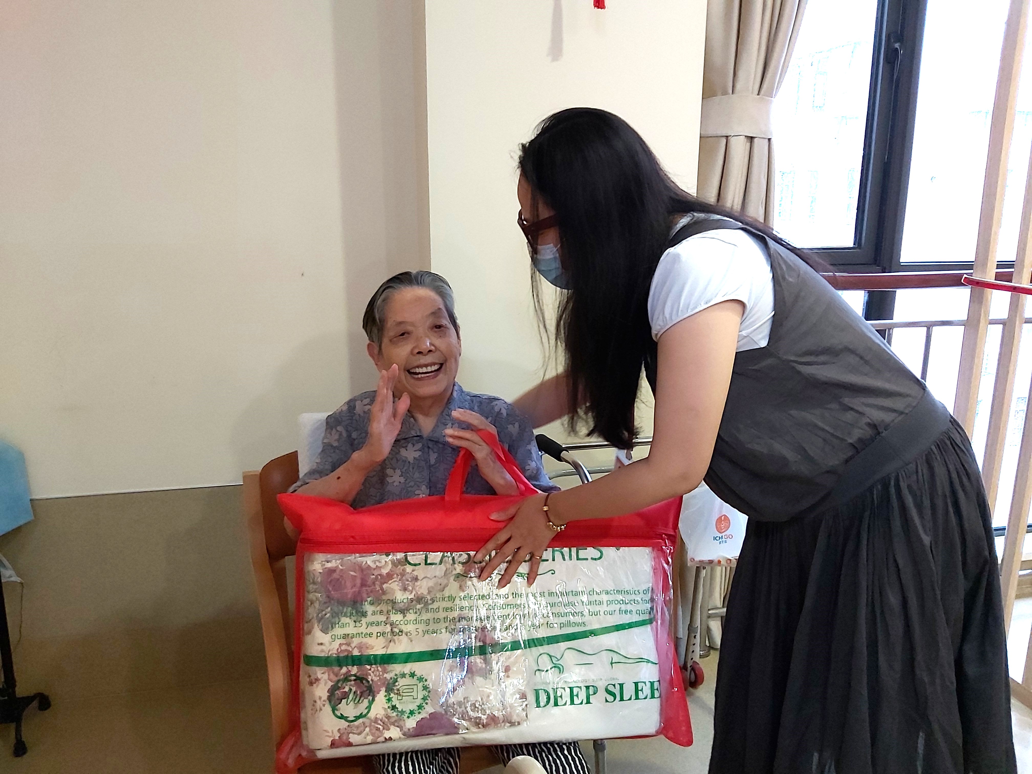在长者们午睡过后,肖院助也带着礼物来到了长者们的居室,将枕头及枕套送到了长者们的手中。长者们在起床后便收到了惊喜,快乐的氛围立刻弥漫在福利院内。