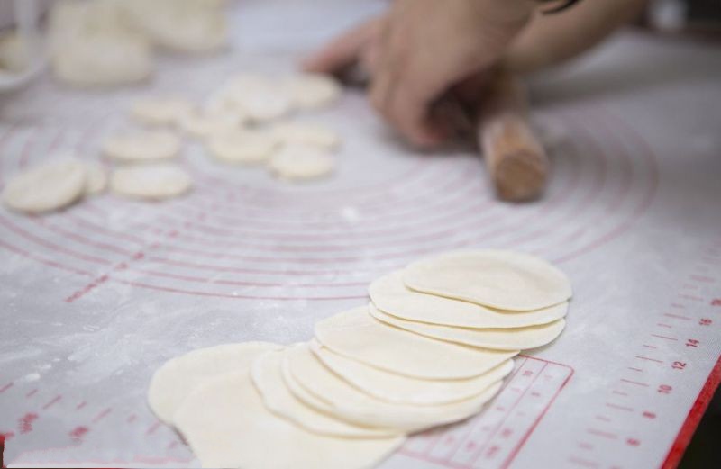 接下来,就是考验真正技术的时刻了。只见“行家”们操起擀面杖,拿起一个面团,便开始了自己“手速”惊人的表演。一边转,一边擀,擀出来的面皮才圆。这里也是有讲究的,必须要圆心厚,周边薄。