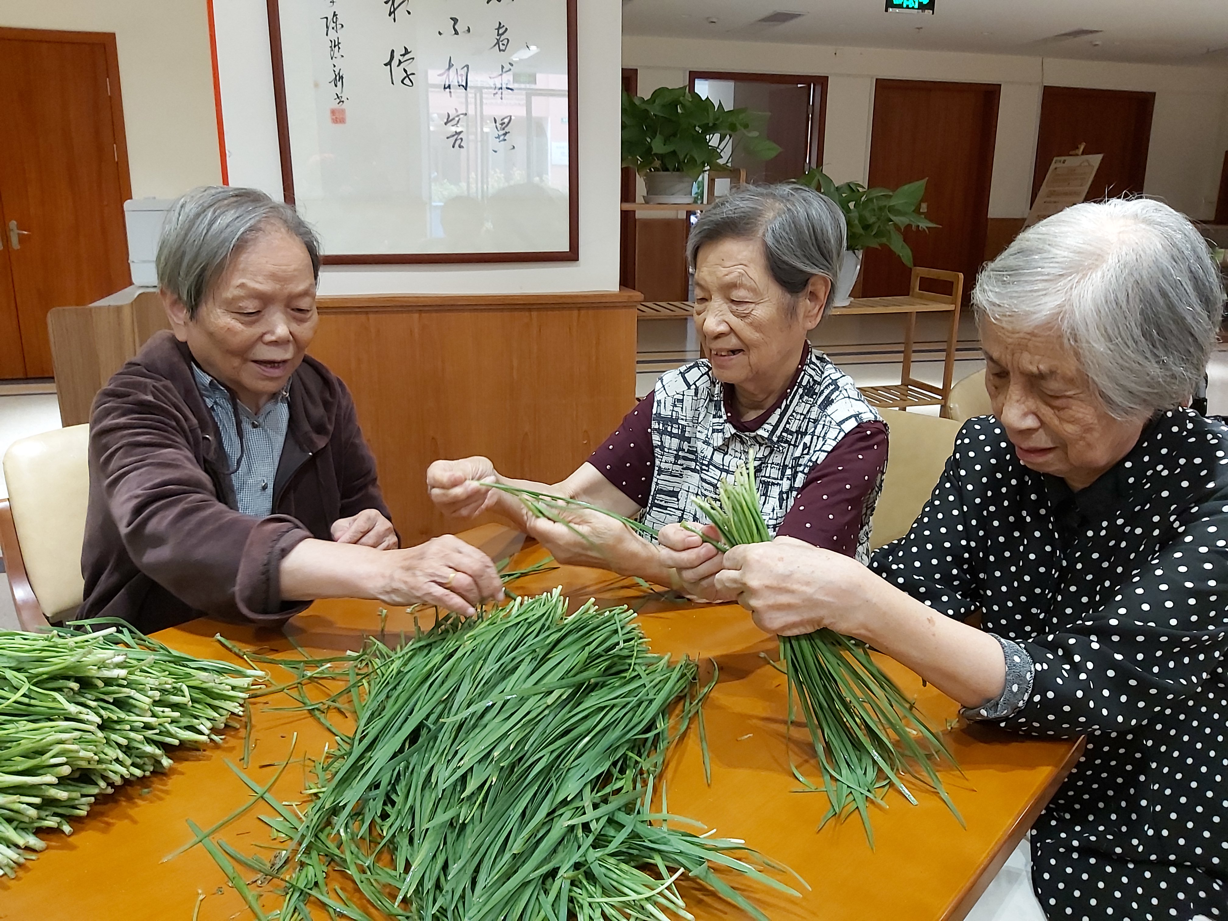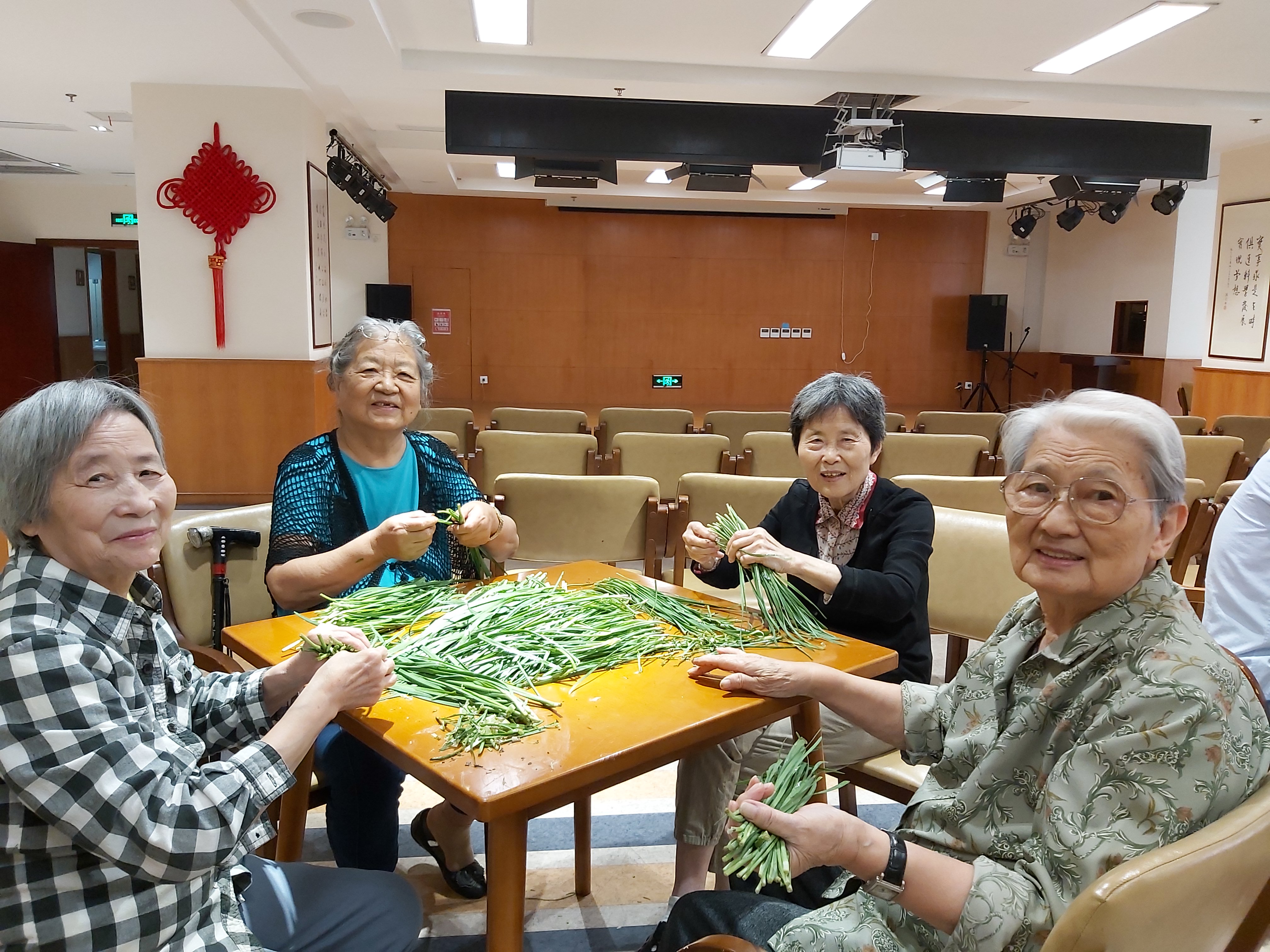 每次到了劳动日,长者们总会早早的来到活动现场,与身边的好友长者一同选择一桌坐下,不一会儿,当长者们陆陆续续前来时,来的稍早一些的长者会招呼来的稍晚一些的长者,与自己同坐一桌,感情总是在不知不觉中变得深厚。“我觉得韭菜饼好吃”“韭菜炒蛋也好吃”这一日,长者们择的是韭菜,那自然就少不了关于韭菜的话题了。