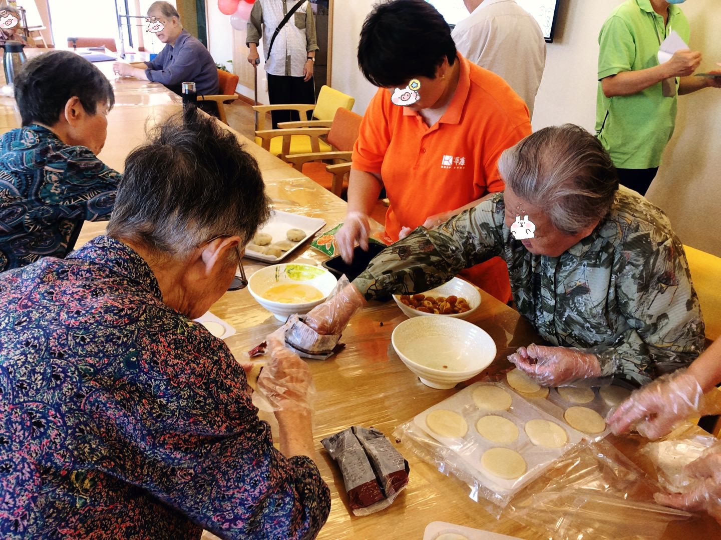 国庆节和中秋节是同一天,当然也不忘了中秋习俗:做月饼,猜灯谜。在做月饼之余,长者们猜灯谜还赢取了精美的小礼品。长者们都兴致很高,有些长者做起了大家的小老师,一个个精致的冰皮月饼闪亮诞生。