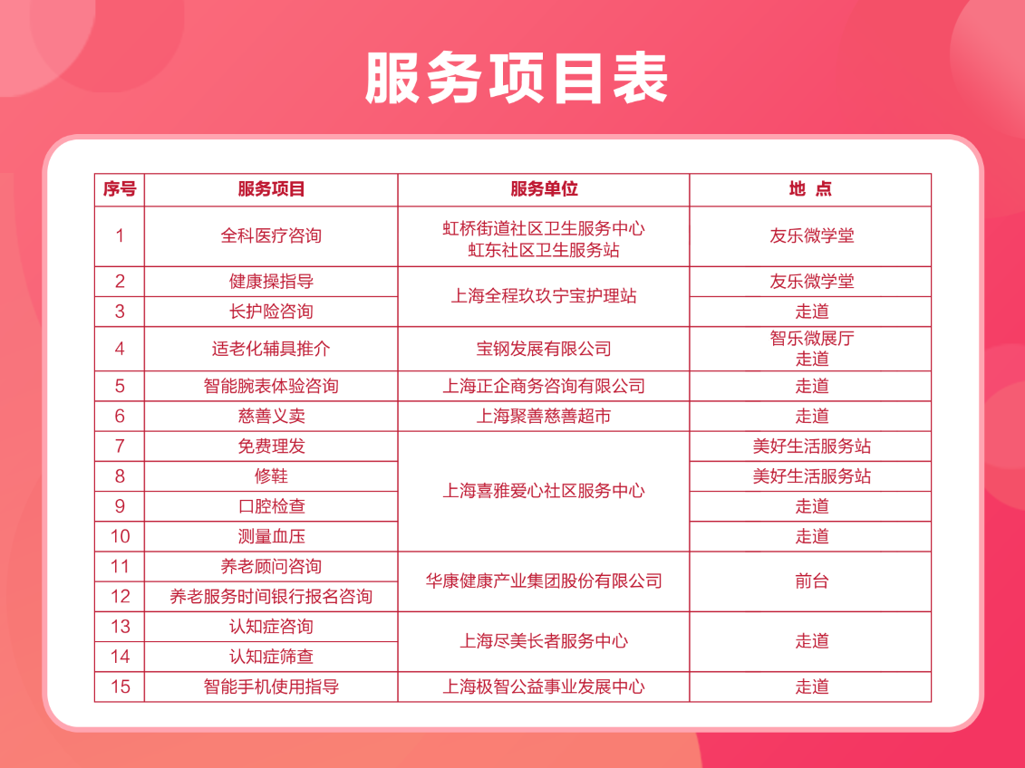 2020年“虹桥养老服务集市”将于10月23日上午9点至11点在虹桥街道社区综合为老服务中心举办,届时中心将携手社区单位、社会组织、第三方专业机构等多元力量现场为您提供专业的养老服务(详见服务项目表),我们真诚期待您的光临!