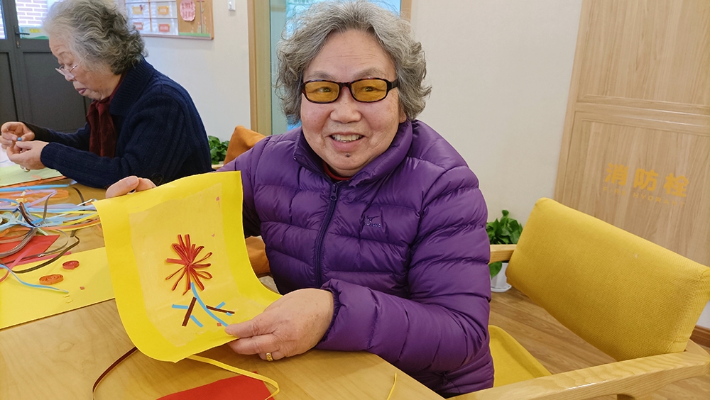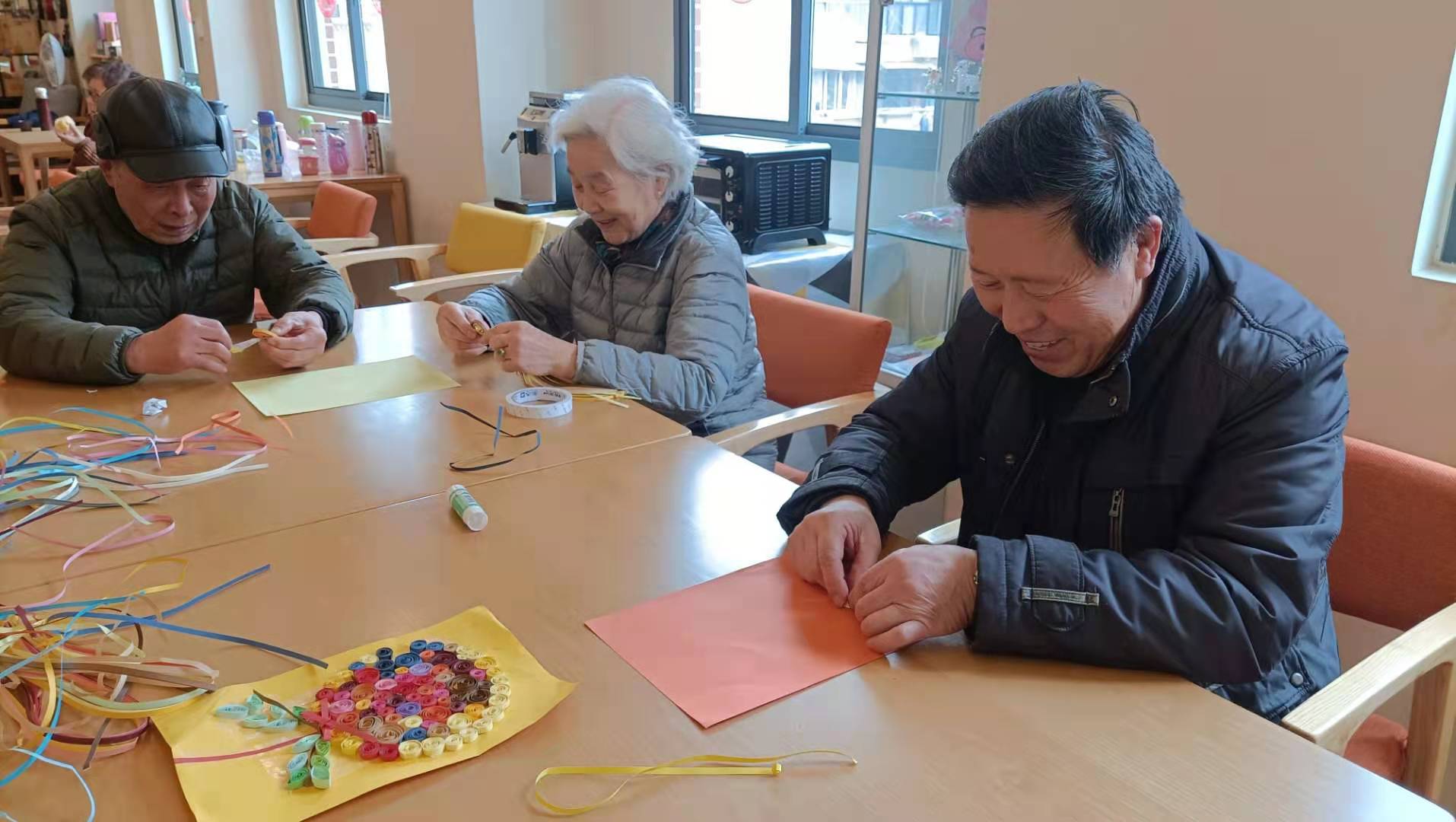 在活动中社工带着大家开启新体验——衍纸画。从简单到复杂,在一次次练习中,爷爷奶奶们熟能生巧地将一条条小彩纸卷起来。彩色的纸条在大家手中变成色彩鲜艳的立体图案,通过卷、捏、拼贴形式等组合创造各种造型,格外童趣。