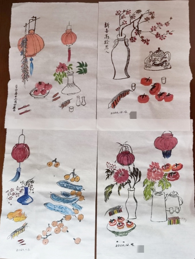 今年,沈老师还在灯笼上为我们用心作画、题字,以此表达心中的祝福,迎接新一年的到来。长者们看到灯笼上的画作与文字后,不禁连连称赞,大家都说,灯笼上的每一个文字、每一幅画中,都包含着美好的寓意。