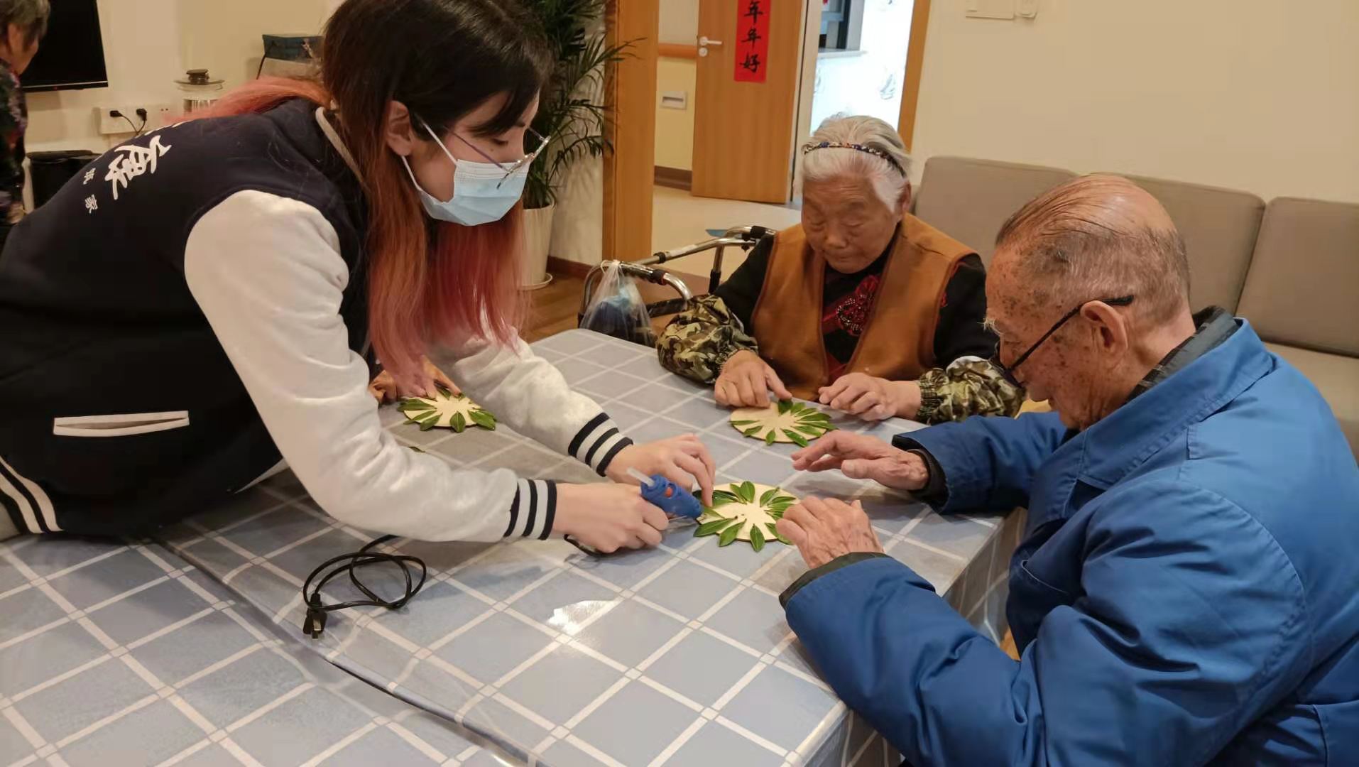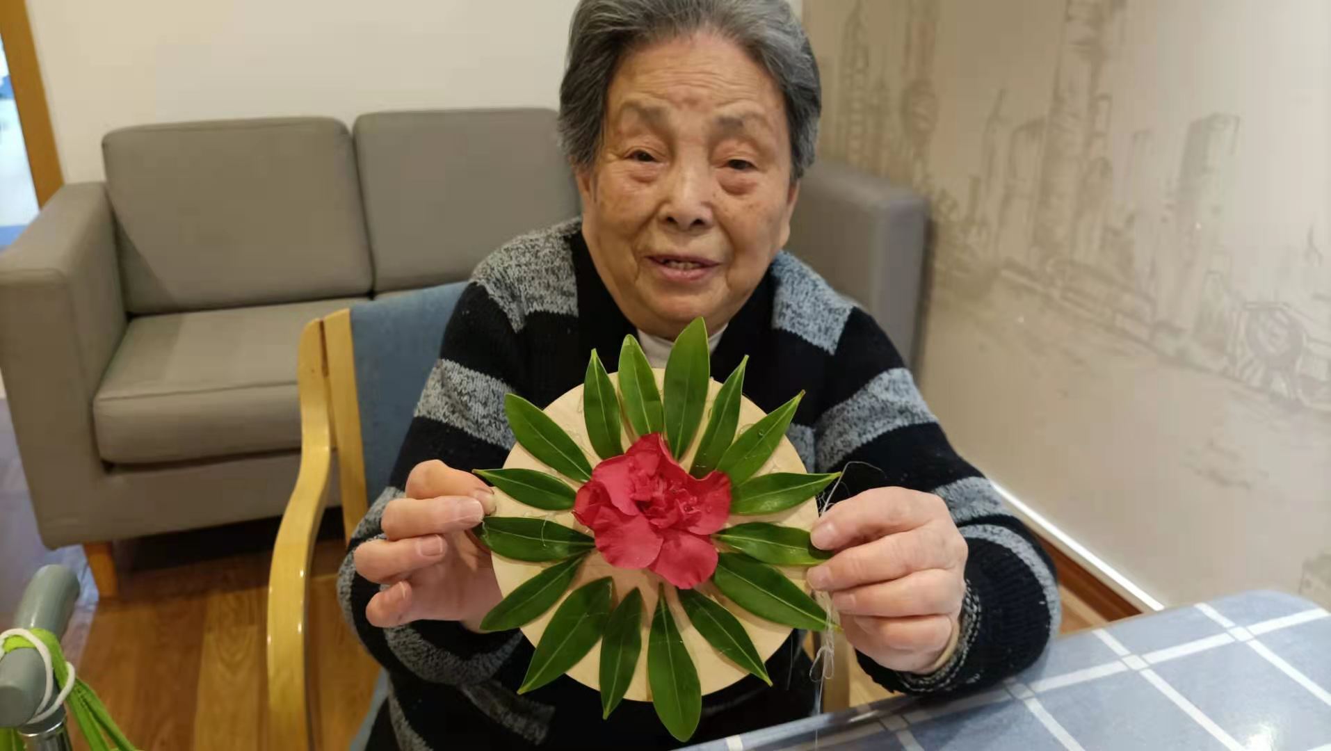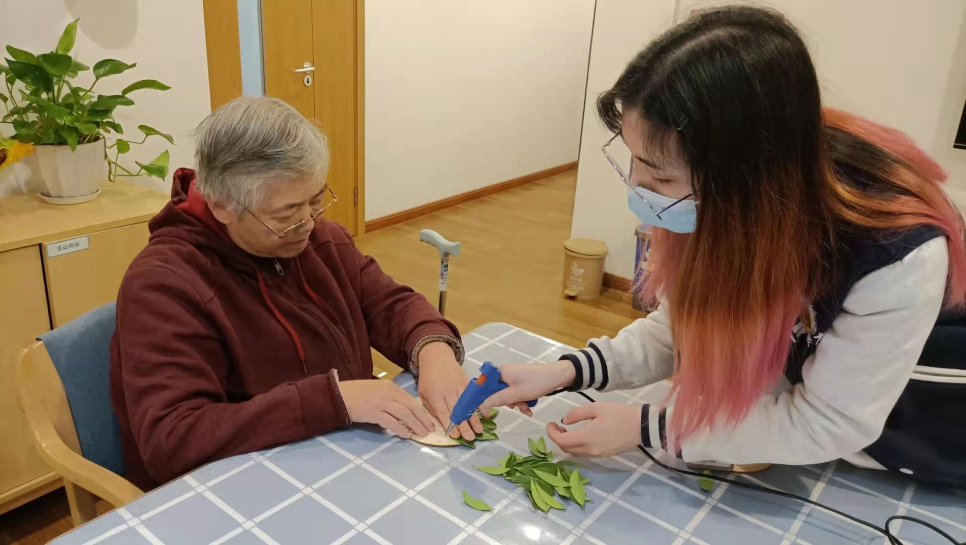 以永生花为灵感,别致的树叶画格外吸引爷爷奶奶们的兴趣。充分利用大自然的资源,开动想象力,创新DIY。活动开始,大家一边听讲解一边提问。97岁的老兵钱爷爷问,“这像枪的是什么?”社工解答,“这是热熔胶,冷的时候是固体的,热的时候是液体,但很快就凝固,固定东西很方便。”钱爷爷听了哈哈大笑,说道,“真是活到老学到老,有趣!”在制作过程中,大家认真地将一片片叶子贴好,每一片树叶都错落有致地摆放。很快,大家都摆好了属于自己的树叶盘雏形。吴奶奶说,“原本树叶枯了也就没用了,现在做成了装饰,非常有意思。”