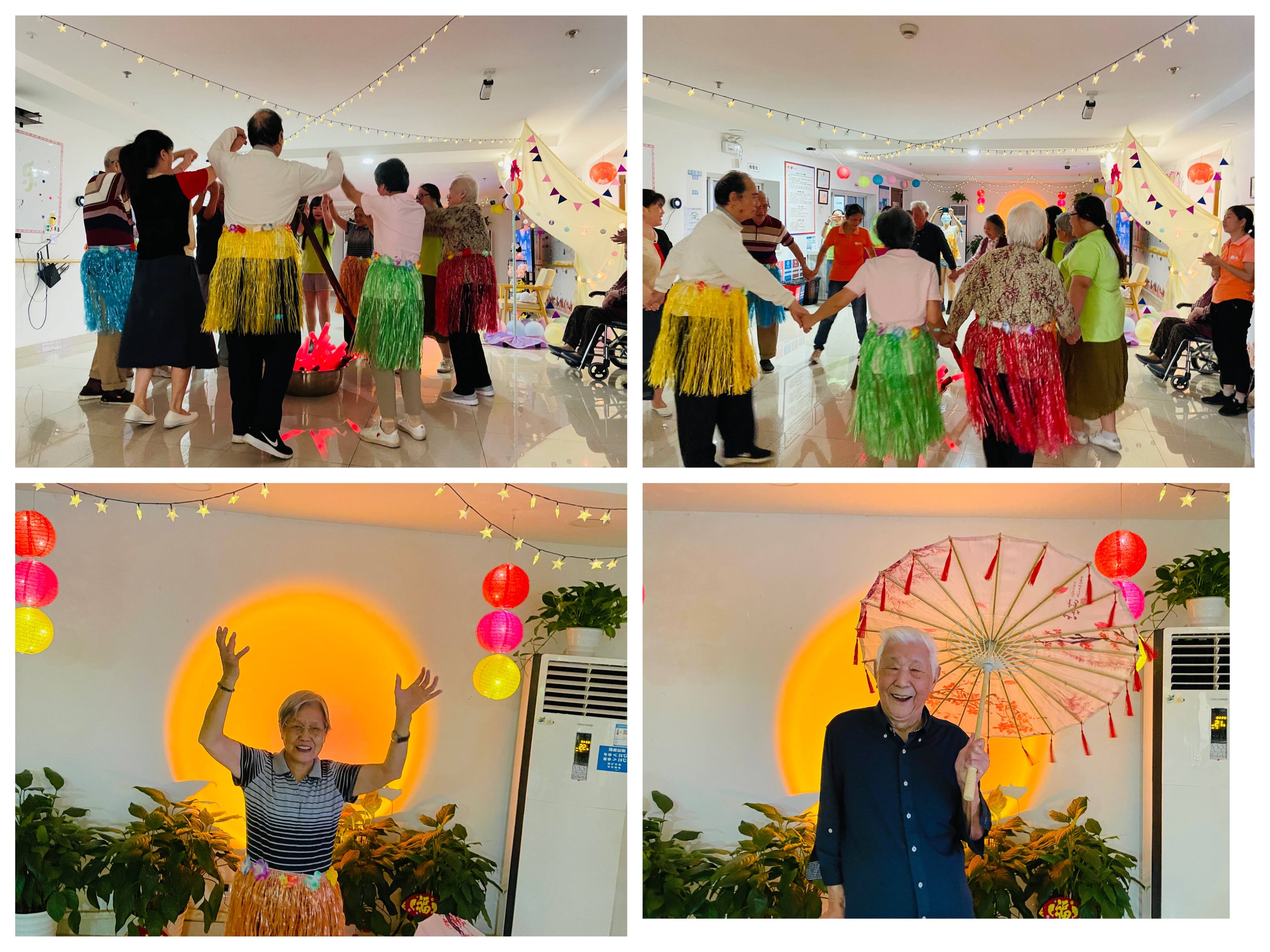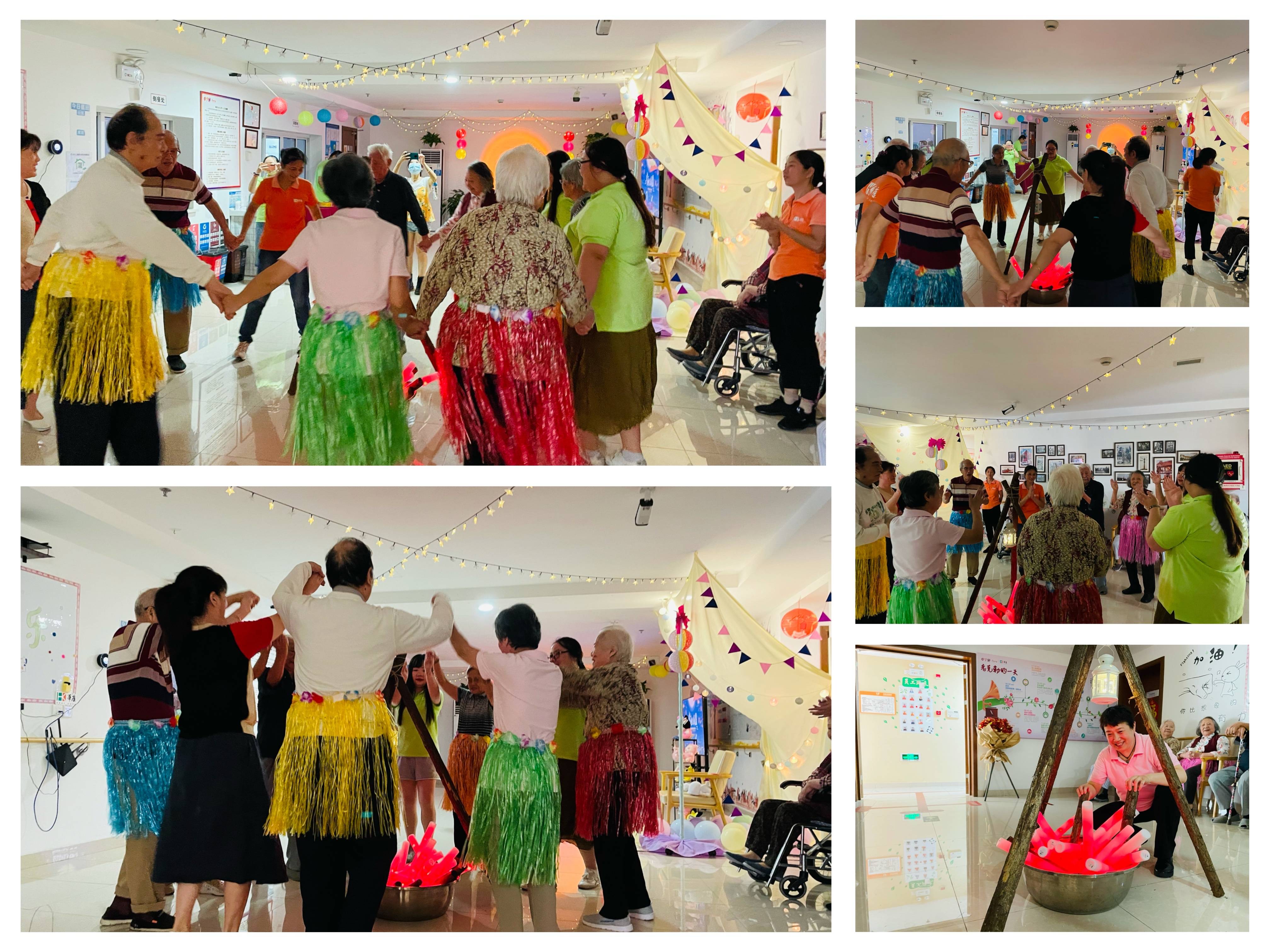 当熊熊的篝火开始燃烧,篝火晚会正式也在一片欢乐声中开始了!周家桥中心的爷爷奶奶和工作人员共同在欢声笑语中,伴着悠扬的音乐翩翩起舞,随着步伐摆动双臂,手拉着手一起尽情的欢呼、舞蹈,一阵清风吹来,那篝火似有灵性般地与它追逐,篝火越烧越猛,映射在长者那一张张快乐的脸上。