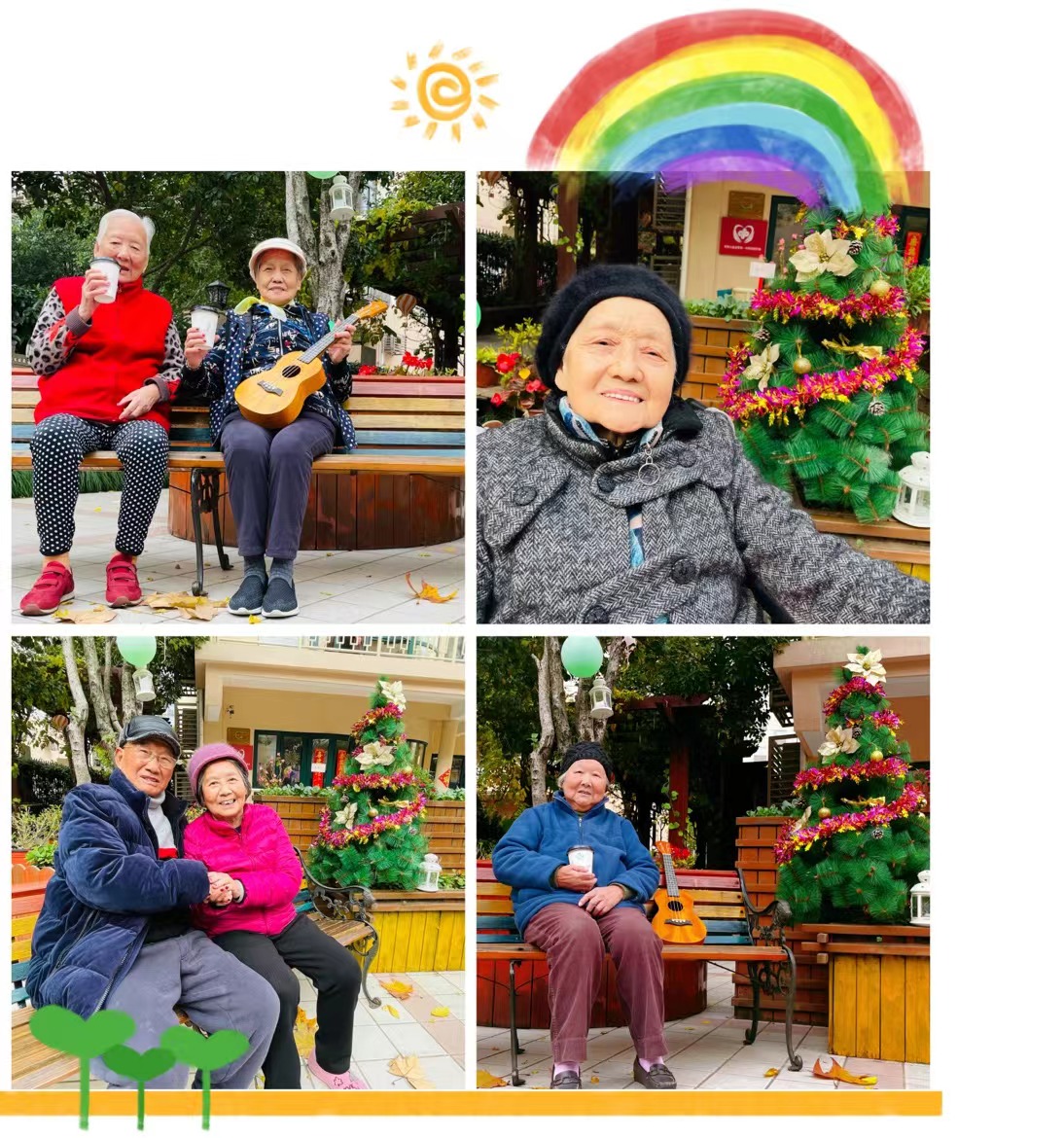 爷爷奶奶们坐在圣诞树旁的长椅上