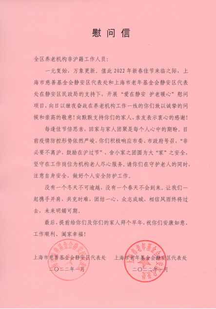 上海市慈善基金会静安区代表处、上海市老年基金会静安区代表处的慰问信,也让万分感动与温暖,涌入了福利院员工们的心头。