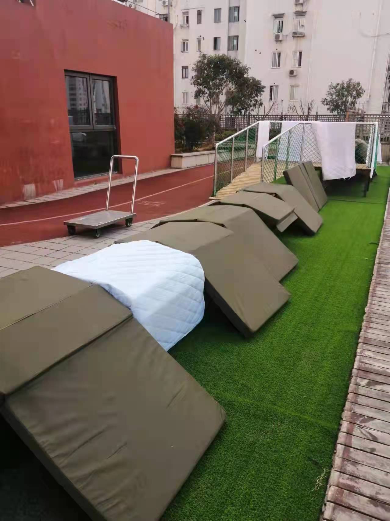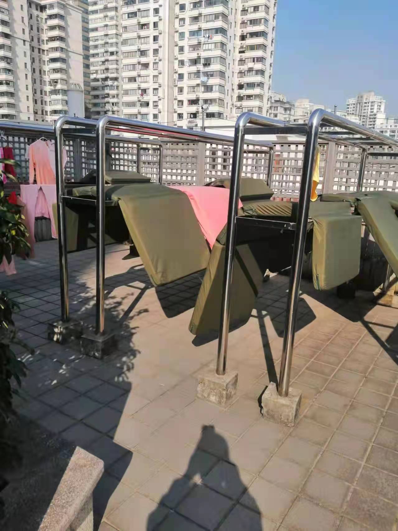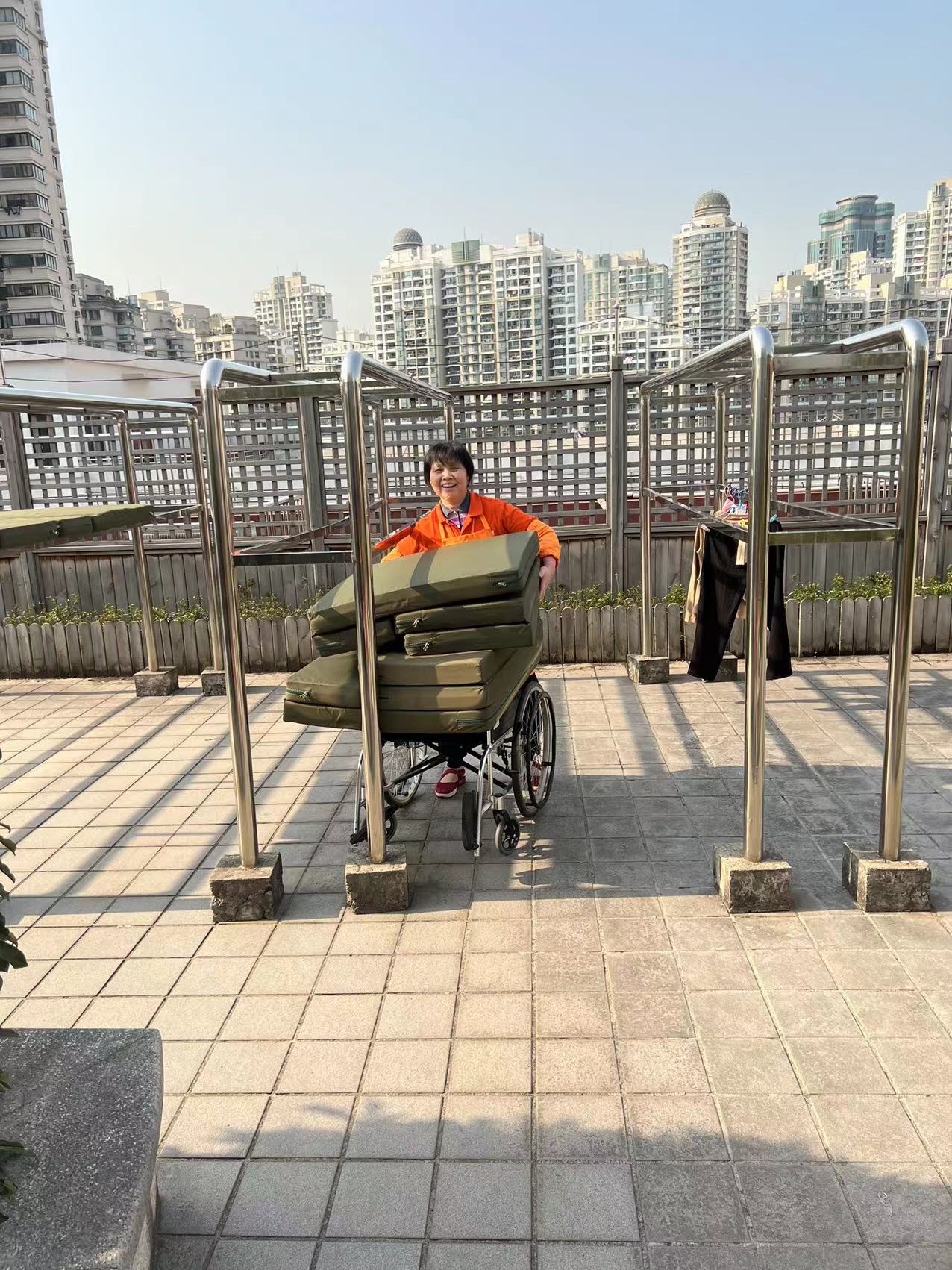 护理员们对长者们的照护,还是一样尽心尽力。原本,在阳光正好的时候,护理员们便会将长者们的被褥及床垫拿到屋顶花园“晒晒太阳”,杀杀菌,封闭管理后,护理员们更是勤晒,没有一丝松懈。