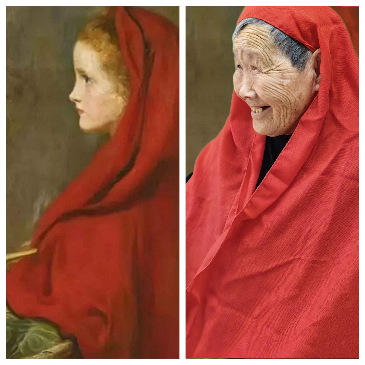 《披纱巾的少女》丁奶奶演绎了两种风格的名画作品。