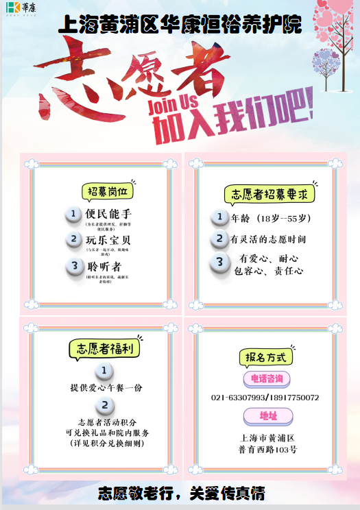 上海黄浦区华康恒裕养护院开始招募志愿者啦~