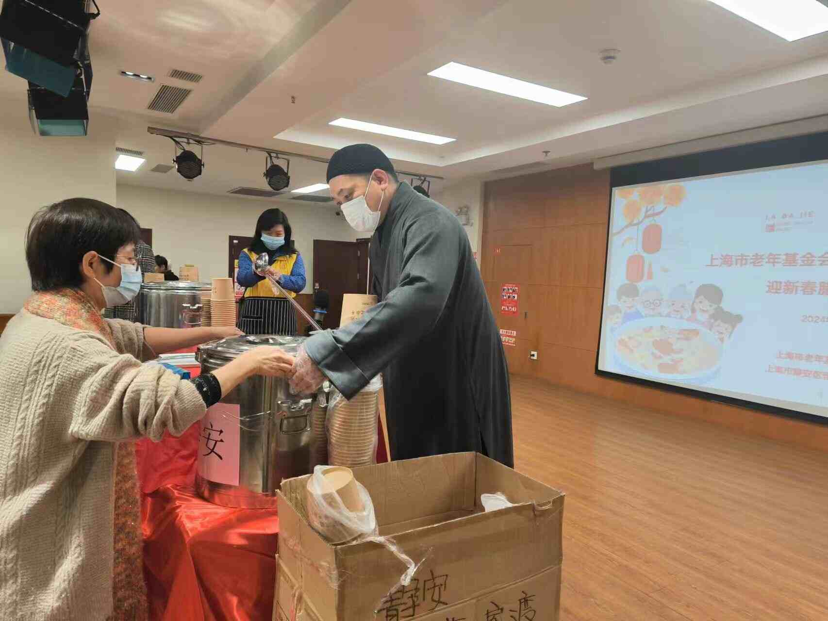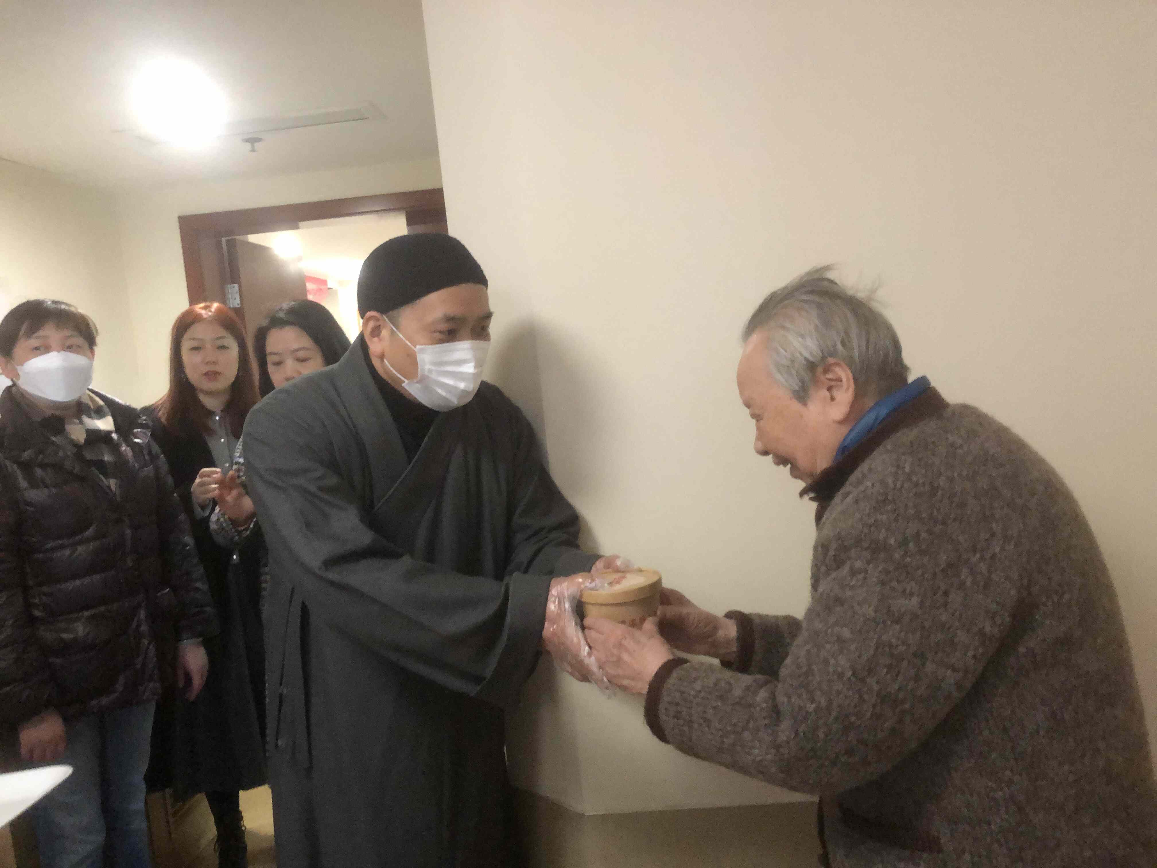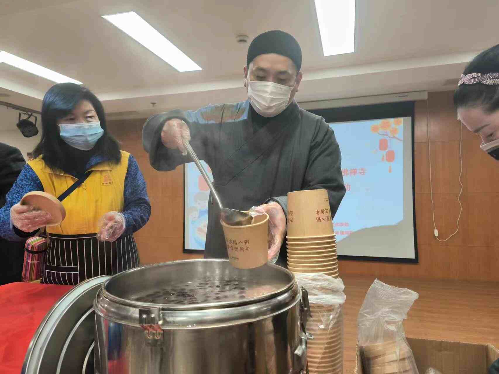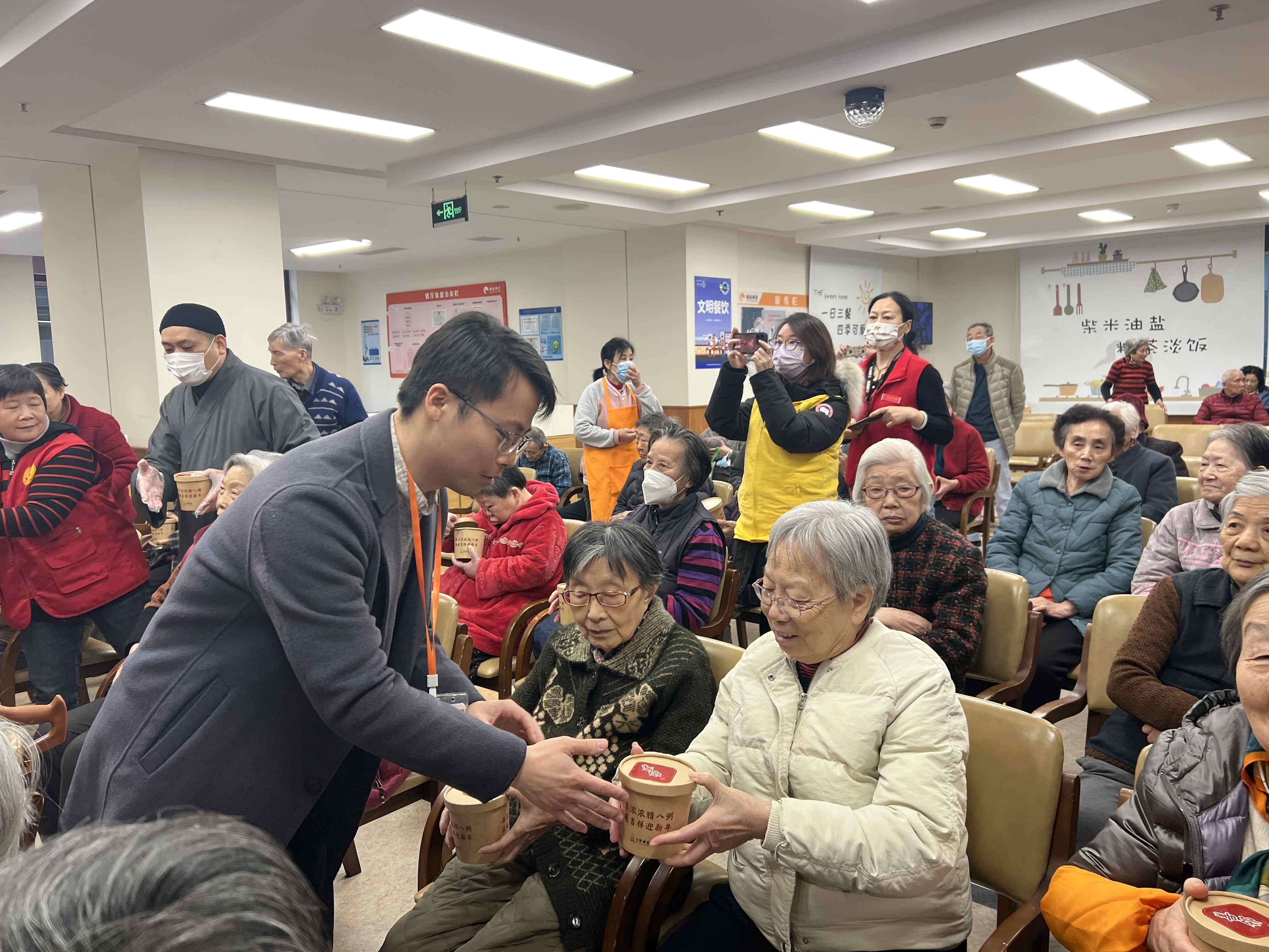 活动现场热烈的活动氛围,随着腊八粥的香味弥漫开来,在玉佛禅寺的照贤法师带领下,现场工作人员将一杯杯打包好的腊八传递至长者手中,为大家送上节日祝福。