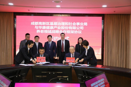 2019年1月30日,成都高新区基层治理和社会事业局与华康健康产业股份有限公司达成养老领域战略合作。成都高新区党工委副书记、管委会主任余辉、华康健康董事长聂建明、总裁王东峰、副总裁朱斌等领导出席签约仪式。
