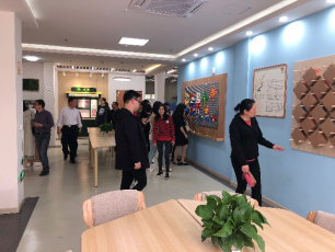 袁院长为领导们简要介绍了华康北桥老年福利院的整体功能布局,随后陪同柳局、钱书记一行人参观了机构单元区域、认知刺激区、家庭互动区、团体活动区、认知训练区、疗愈花园等地,进一步了解院内入住长者生活现状以及硬件软件设施。
